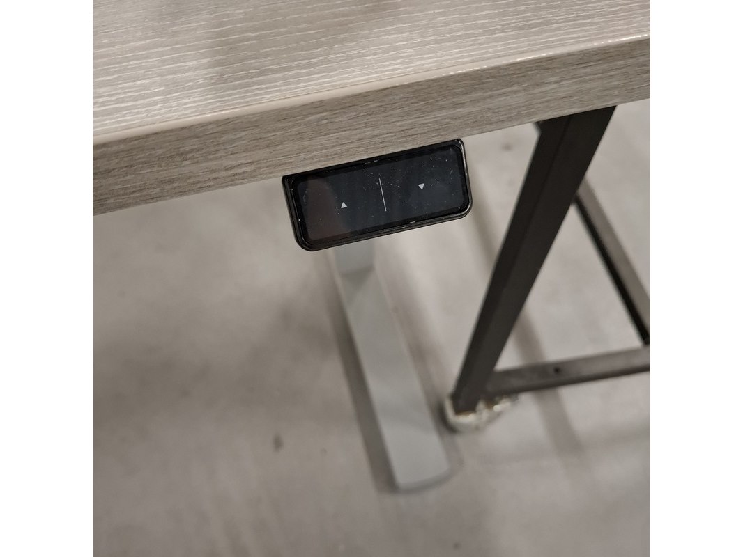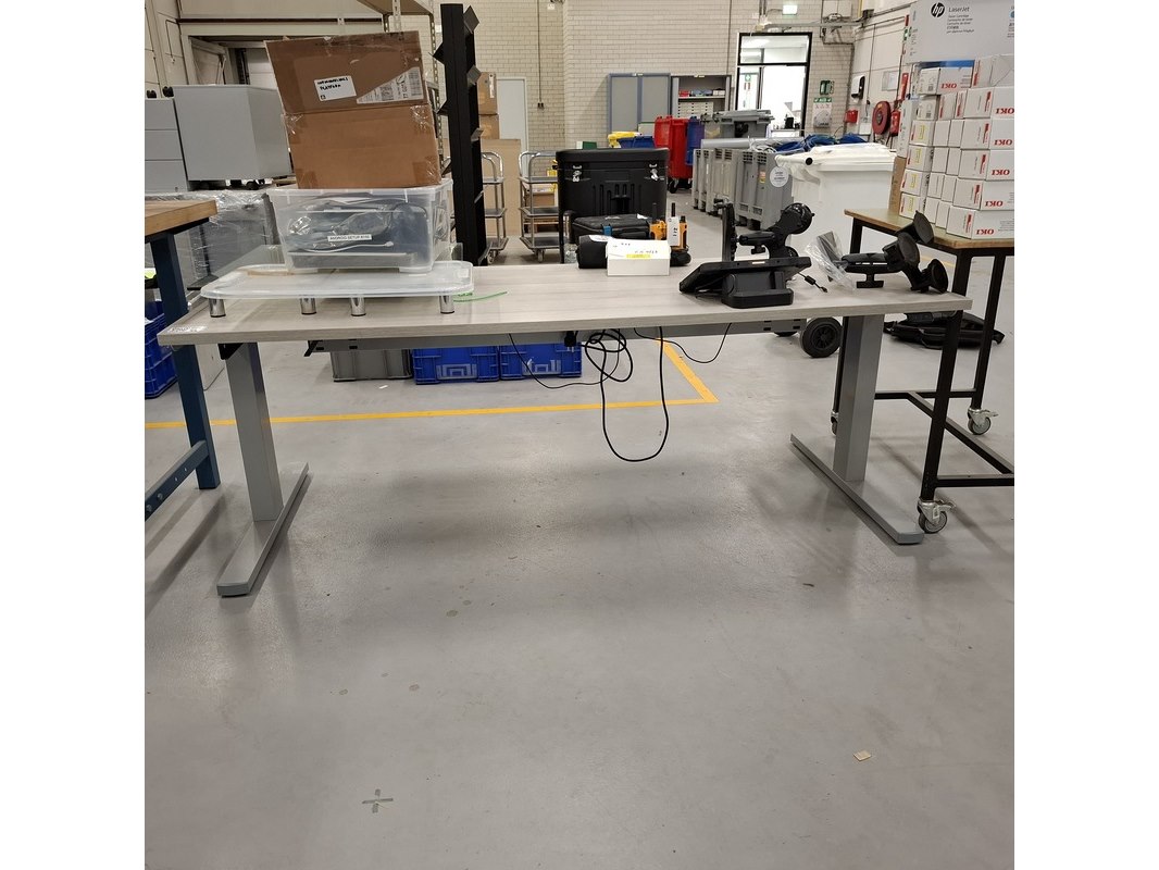 Product: Bureautafel met sta-zit bureau Specificaties: 1x lxbxh ca. 160x80x76cm sta-zit lxb 180x80cm Exclusief zichtbare randzaken Inclusief trolley
