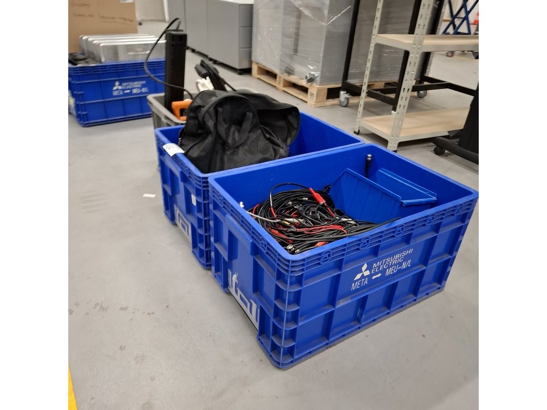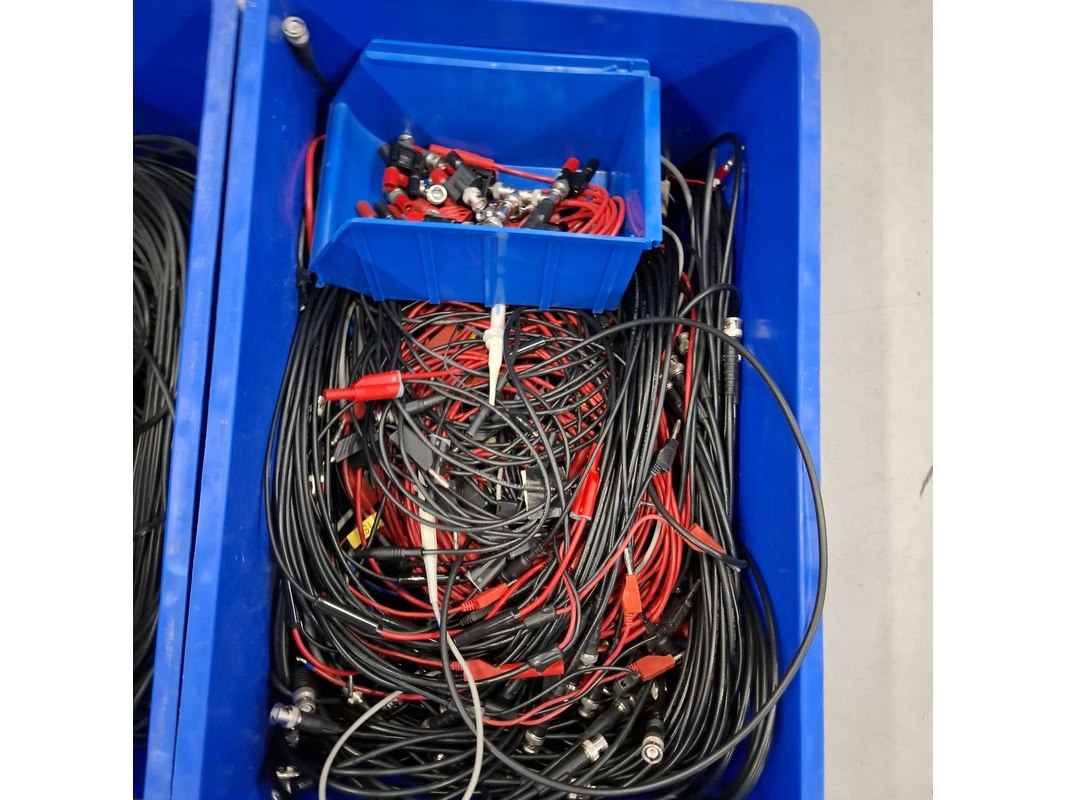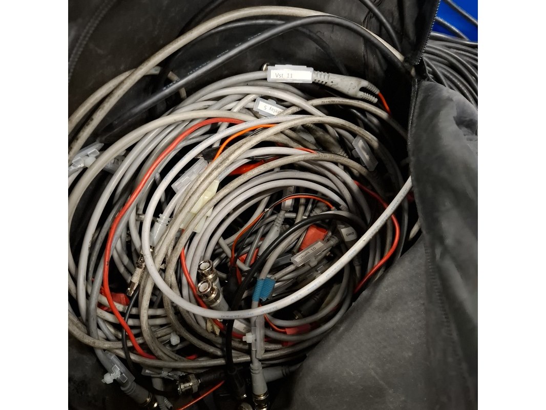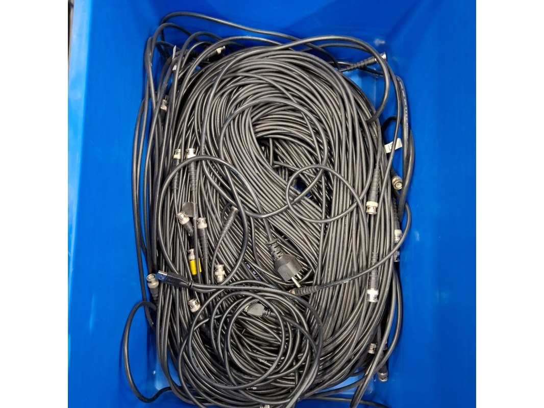 Product: Partij diverse bekabeling Specificaties: Bestaande uit o.a. verlengsnoeren, BNC kabels, waarvan een aantal langer dan 5 meter. exclusief kratten