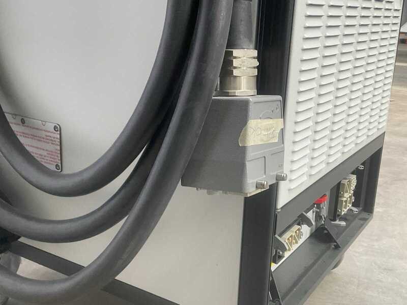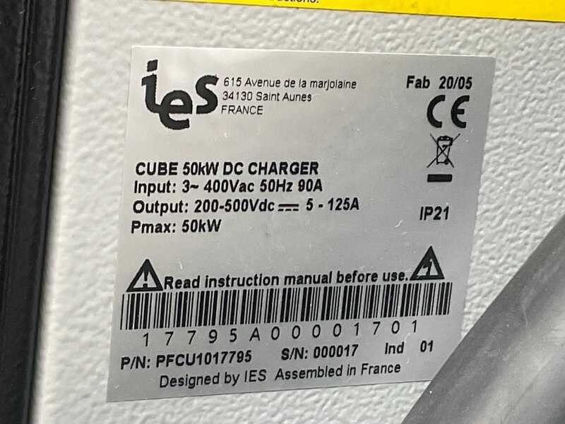 Merk: Ies Product: Mobile auto acculader Kleur: grijs Materiaal: staal Afmeting: L680 x W610 x H900mm BouwJaar: 2005 Conditie: gebruikt Specificaties: Type: mobile acculader voor e auto's input 400V 90A output: 200-500 V 5- 125A Pmax 50Kw s/n: 000017