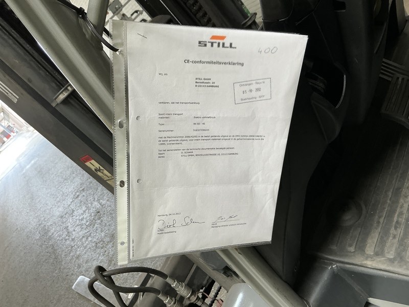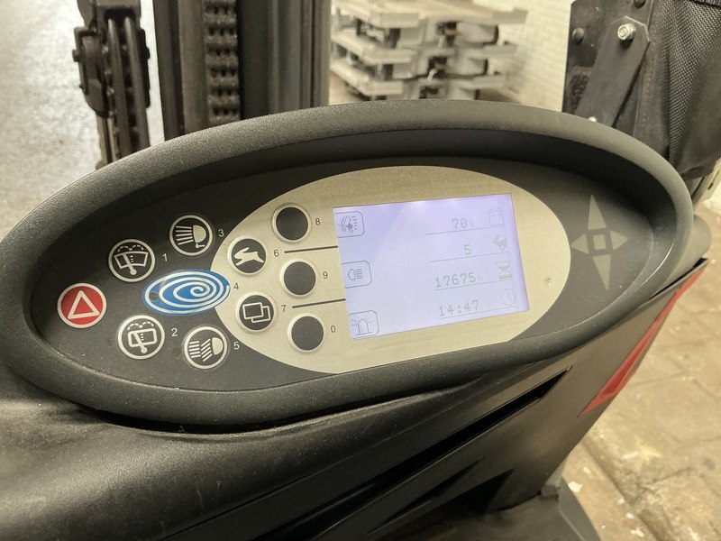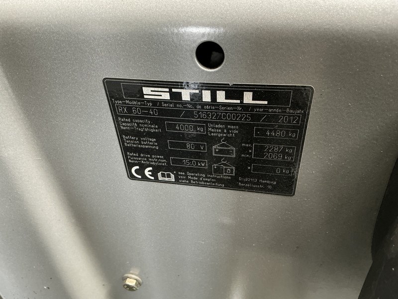 Merk: Still Product: Heftruck Kleur: grijs/oranje Materiaal: staal Afmeting: L3000 x W1450 x H2200mm BouwJaar: 2012 Conditie: gebruikt Specificaties: Voltage: 80V; Batterijtype: M Bedrijfsuren: ca 17675 vorklengte: 2400 mm dubbele mast