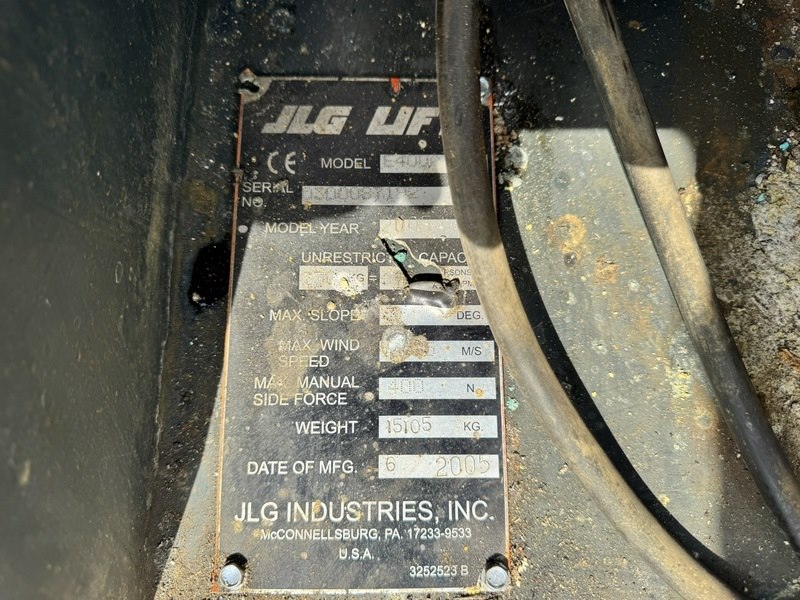 Merk: JLG Product: Telescoop hoogwerker Kleur: blauw/beige Materiaal: staal Afmeting: L680 x B150 x H200 cm BouwJaar: 2005 Conditie: gebruikt Specificaties: Werkplatformhoogte: 15 meter Niet-afgevende banden: Ja Serienummer: 0300087192 Gewicht: 6888 kg
