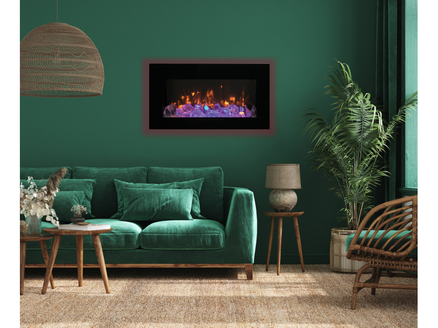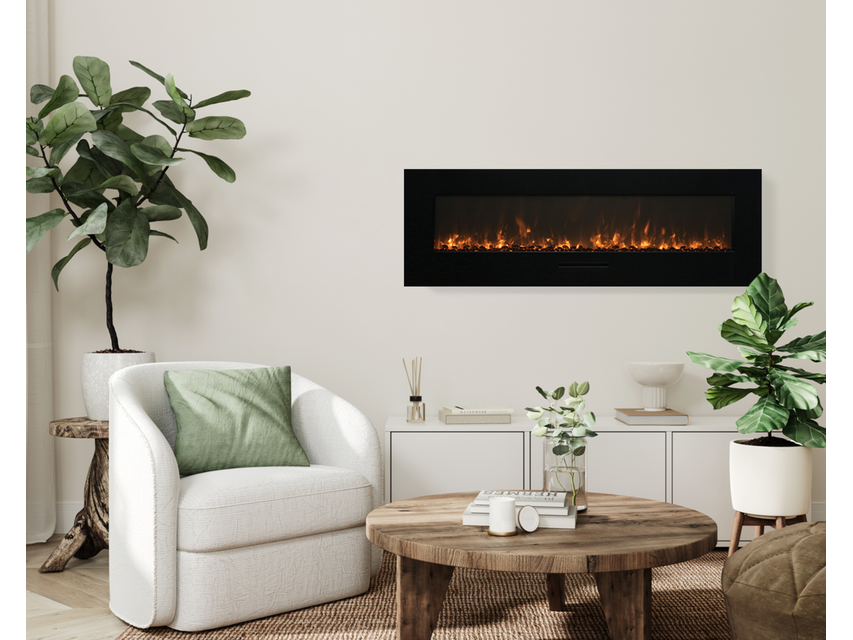 Merk: Remii Product: Elektrische sfeerhaard Kleur: Zwart Materiaal: Metal Afmeting: Appliance Width 59 1/4” or 150.6 cm Appliance Height 19 7/8” or 50.6 cm Appliance Depth 6 1/8” or 15.5 cm BouwJaar: 2018 Conditie: Nieuw Specificaties: The WM-FM-BG is a stunning electric fireplace featuring Amantii’s exclusive flame presentation perfect for any space. The WM-FM series models can be built in flush or wall mounted electric fireplace with included brackets. Heat is emitted from a single slot in the face of the surround. 13 colors of surround back-lighting illuminate spaces creating even more ambiance. All Built-In Flush Mount / amantii wall mount electric fireplaces come standard with a driftwood style log set and optional decorative media of EMBER are available for purchase. The standard surround box for the WM-FM-BG fireplace is black – White glass surrounds are available for additional purchase. Can be built in flush or wall mounted with included brackets. WiFi App – For complete control from any room. Set the fireplace to turn on before arriving home, or have it turn on automatically when the weather is cold. Customization possibilities are endless. Heat is emitted from a single slot in the face of the surround. State of the art flame presentation: Vibrant, multi-colored state of the art flame presentation – change from Yellow to Orange to Red with just a click of the remote. 13 colors of surround back-lighting Plug on left side Thermostat hard‐wire ready Electrical hard‐wire ready Heat can operate without flame Single remote control for flame, surround back-lighting & heater included Can produce up to 5000 BTU of heat, enough to heat up to 500 sq feet