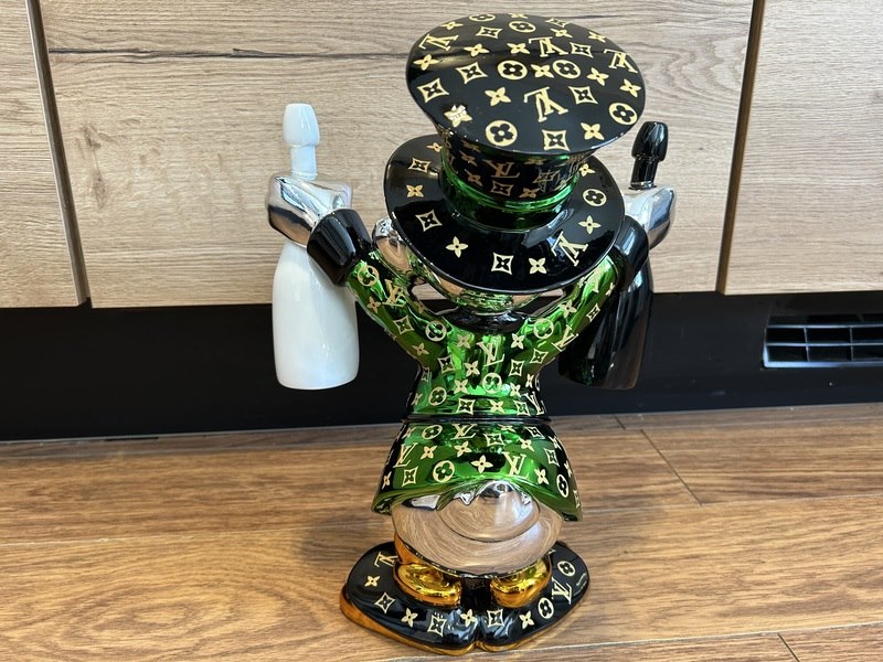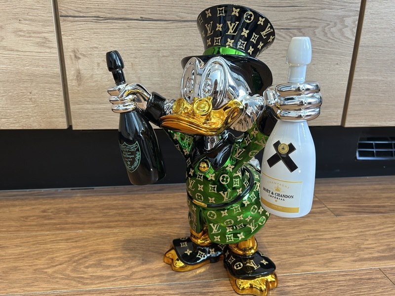 Merk: Lior24 Product: Dagobert Duck beeld Kleur: Groen Materiaal: Resin Afmeting: 42x35cm Conditie: Nieuw Specificaties: Dagobert Duck beeld met Louis Vuitton print