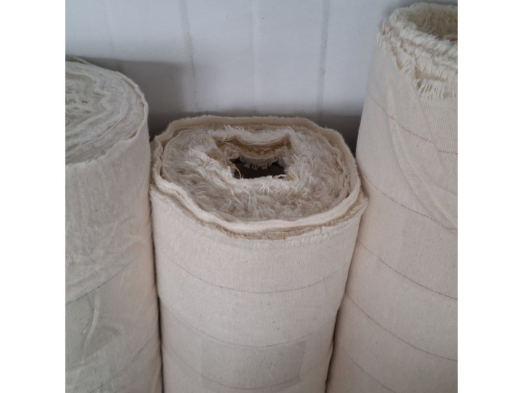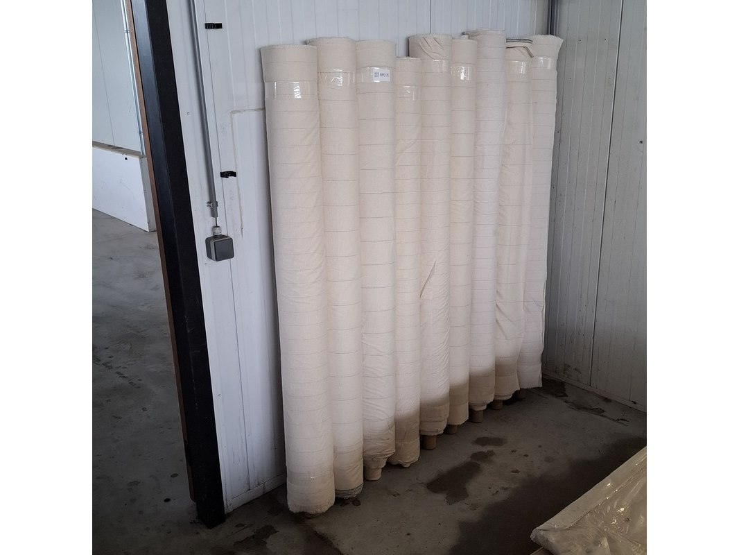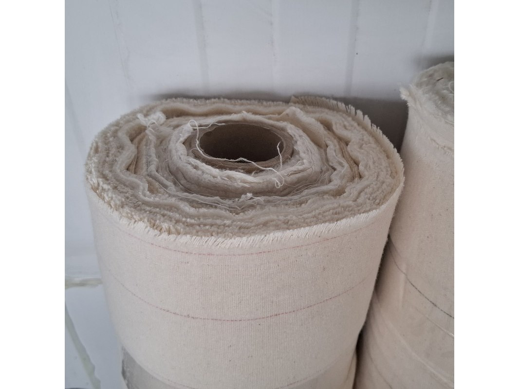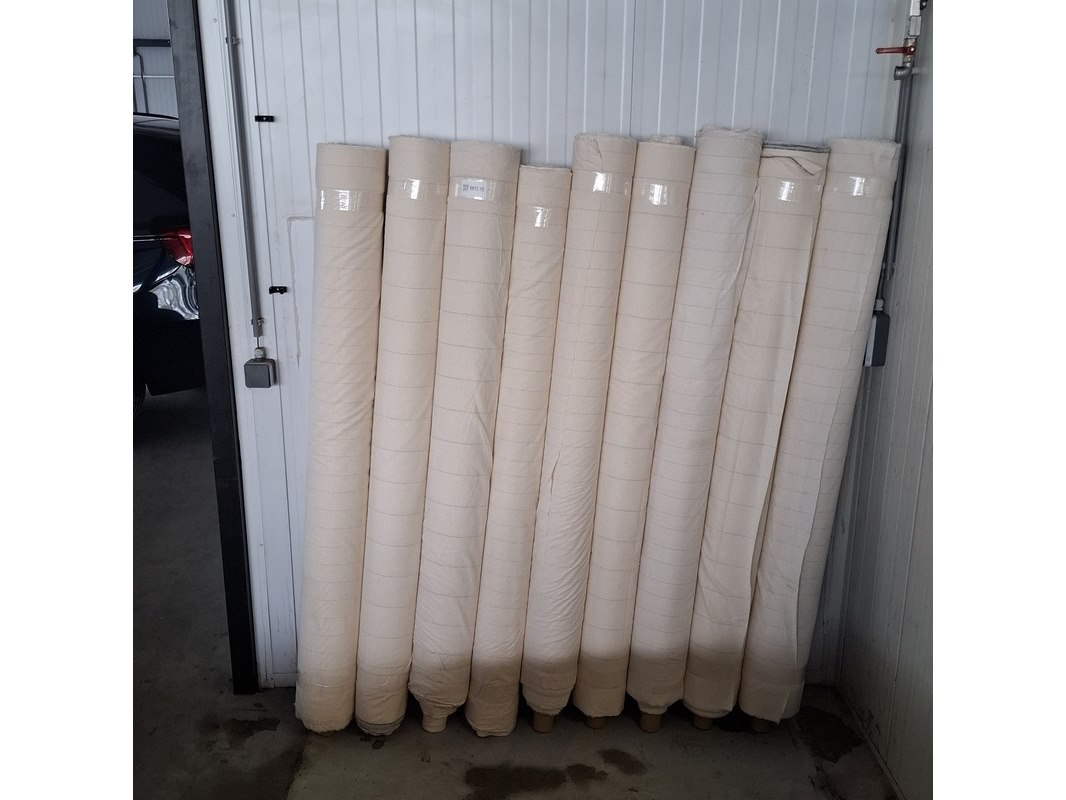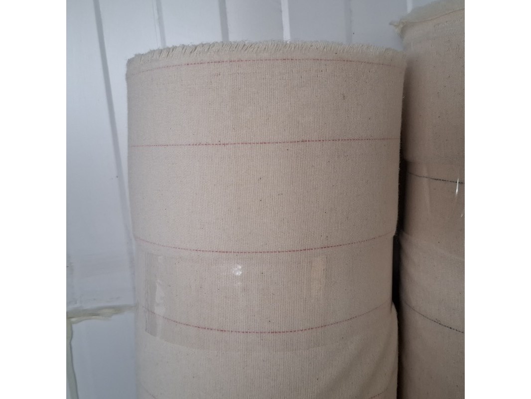 Product: Rol bekledingsstof Specificaties: Ecru met fijne, gekleurde streep Breedte ca. 160 cm Totale hoeveelheid ca. 520 meter, variabele lengtes