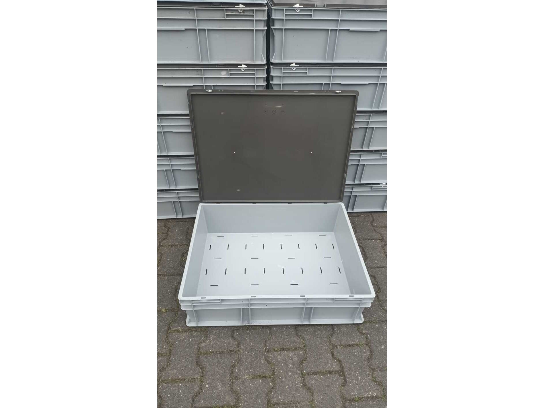 Merk: Engels Product: Grote Bakken met deksel Kleur: Grijs / Chroom Materiaal: Kunststof Afmeting: 80x60x23 cm Conditie: Gebruikt Specificaties: Nette en degelijke bakken met deksel Goed stapelbaar