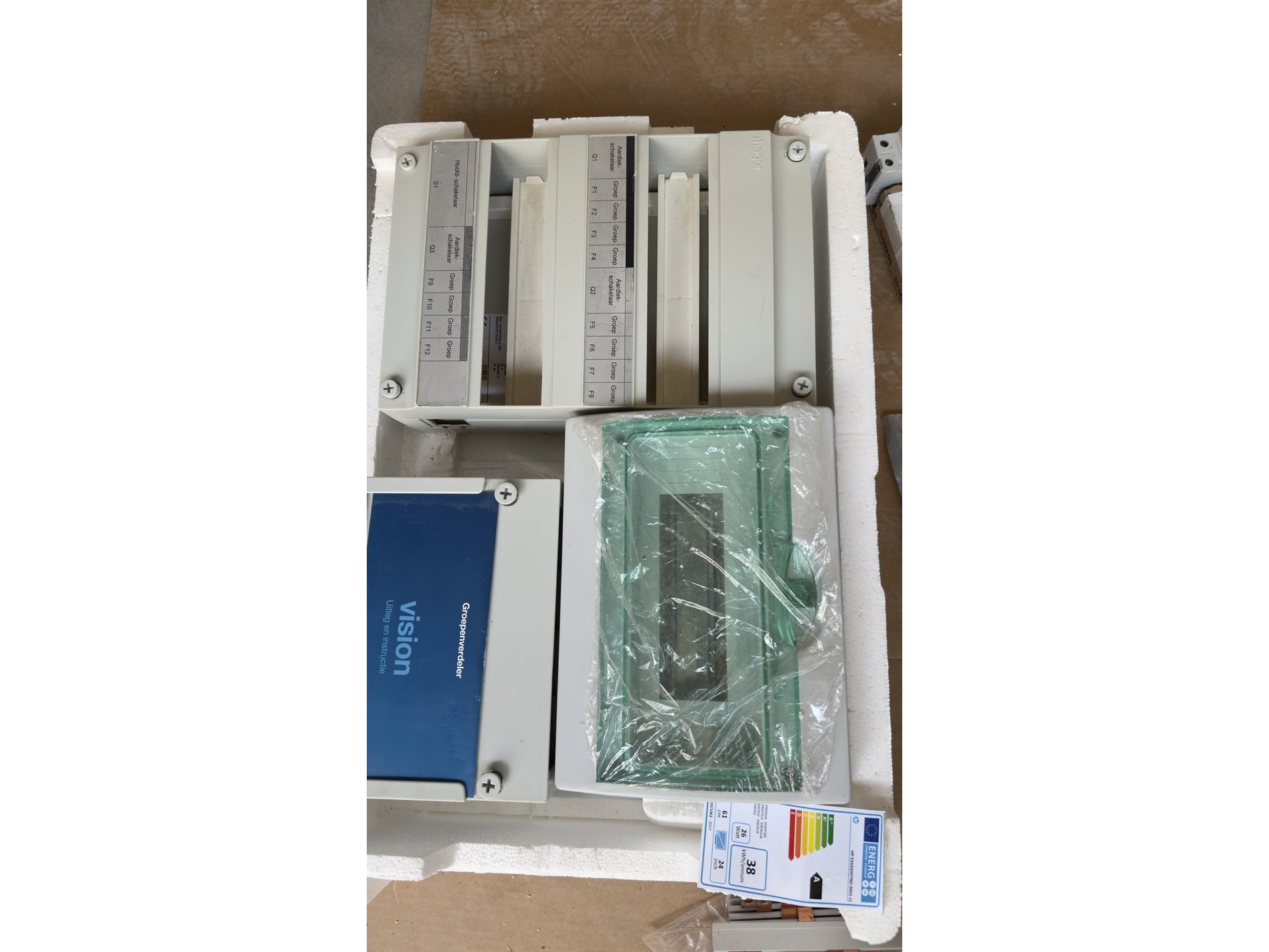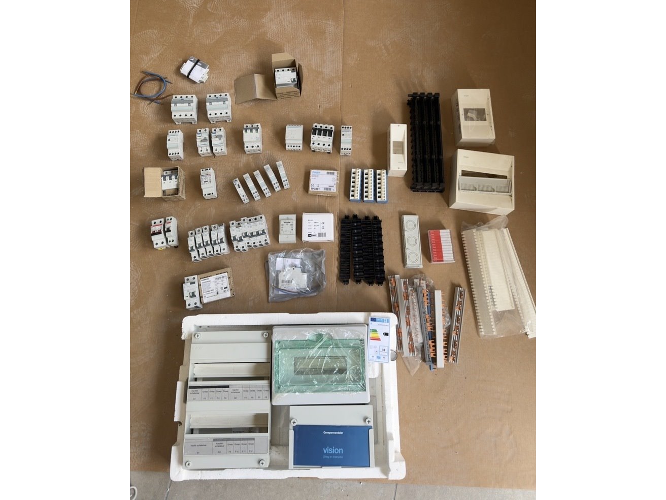 Merk: Hager, Siemens, ABB Product: Elektrisch installatie materiaal Conditie: Nieuw Specificaties: Grote partij elektrische installatie materialen – Hager / Siemens – Nieuw! Complete partij hoogwaardige elektrische installatiecomponenten van topmerken zoals Hager, Siemens en ABB. De partij bevat onder andere: • Groepenkast / verdeelkast (Hager Vision) • Installatieautomaten (o.a. Siemens B10) • Aardlekschakelaars • Klemmenstroken en verdeelblokken • DIN-rails en montagemateriaal • Relais module (Hager TPG581) • Diverse afdekramen en behuizingen • Overige toebehoren en aansluitmaterialen Nieuw / ongebruikt (deels in originele verpakking)