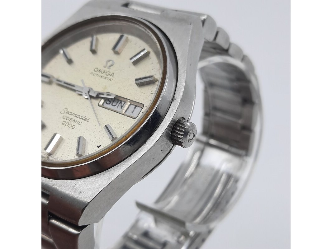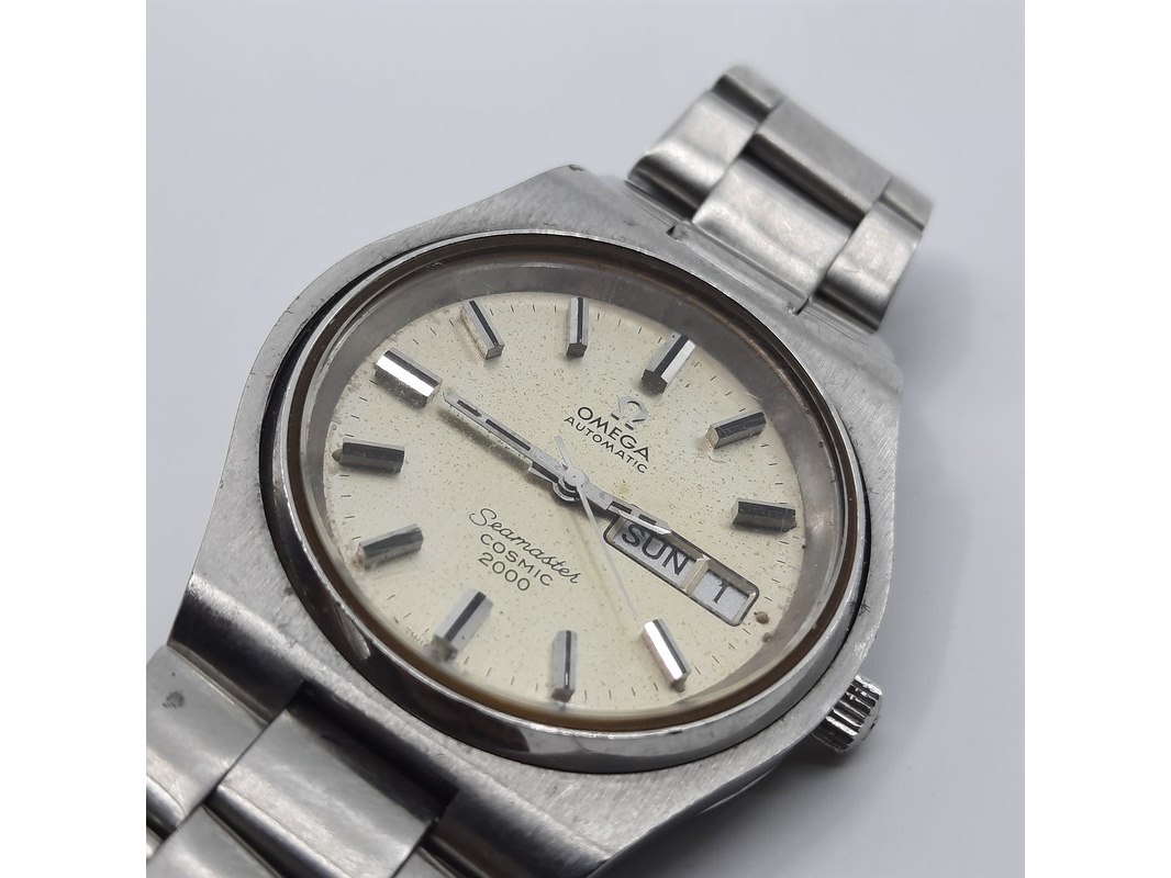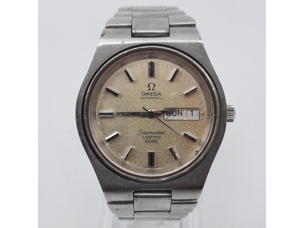 Merk: Omega Product: Heren polshorloge Conditie: Gebruikt Specificaties: Een stalen polshorloge, Omega Seamaster Cosmic 2000. Behoeft onderhoud. Aan stalen band. Geen doos en geen certificaat.