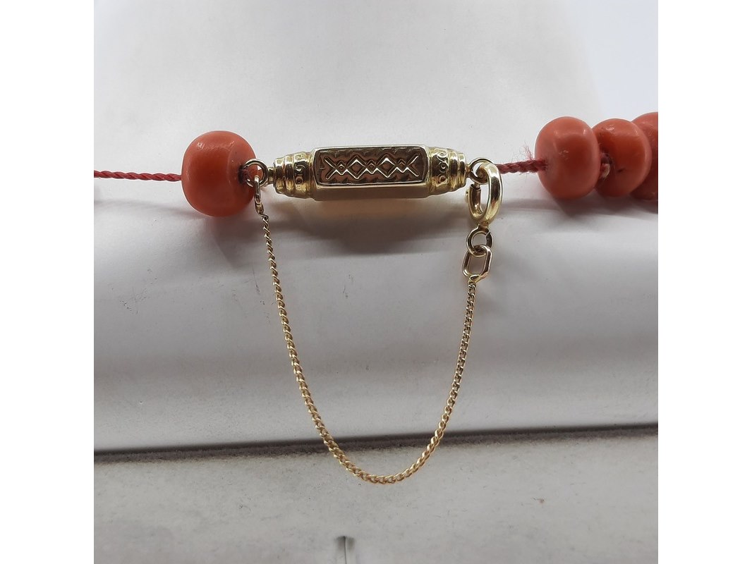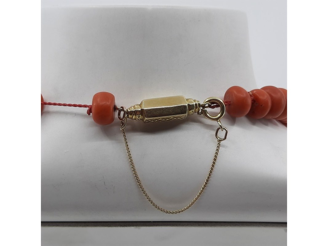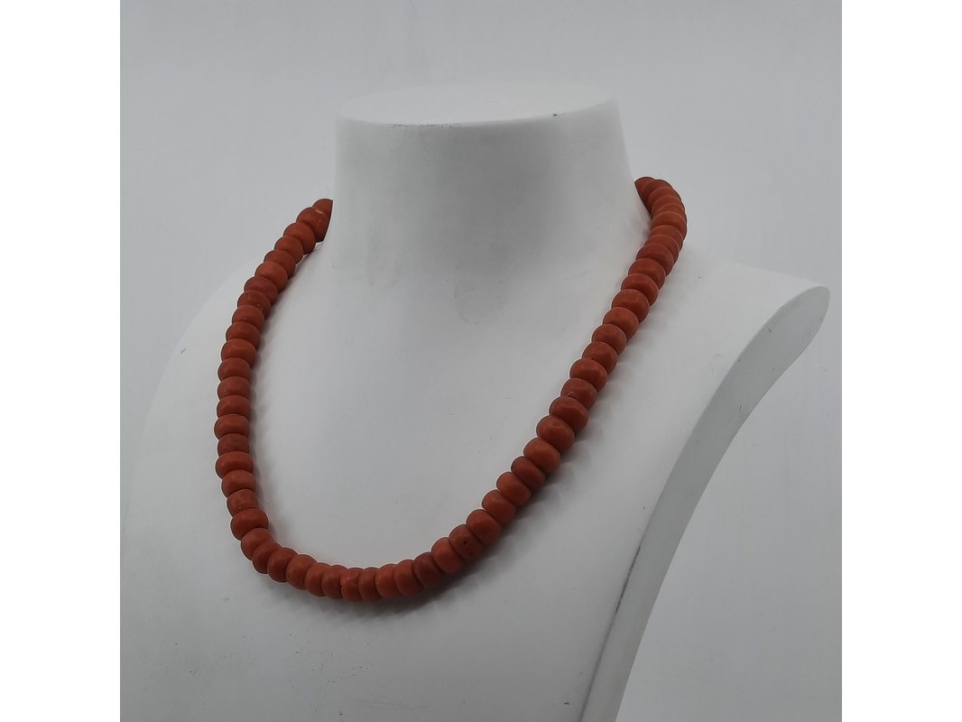 Product: Bloedkoraal collier Afmeting: Lengte ca. 46 cm. Conditie: gebruikt Specificaties: Een bloedkoraal collier met geelgouden sluiting. Diameter kaasvormige kralen ca 8-10 mm