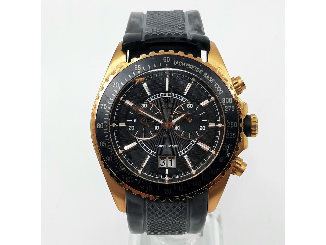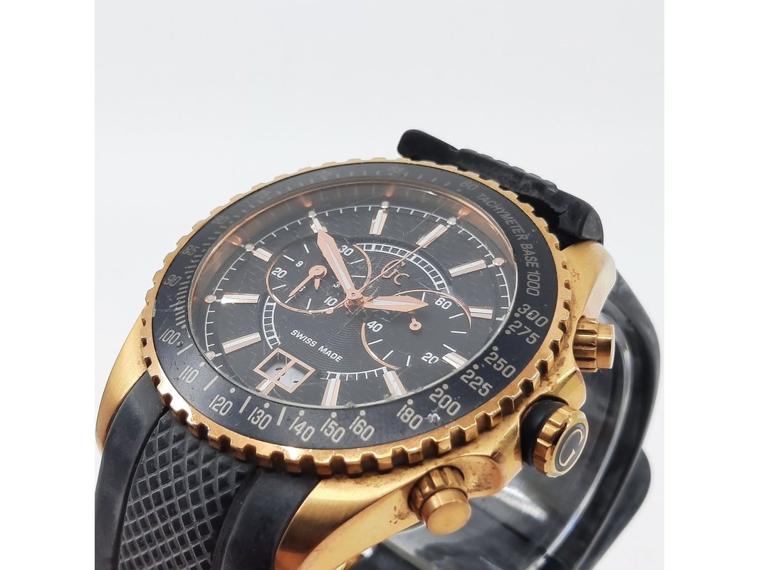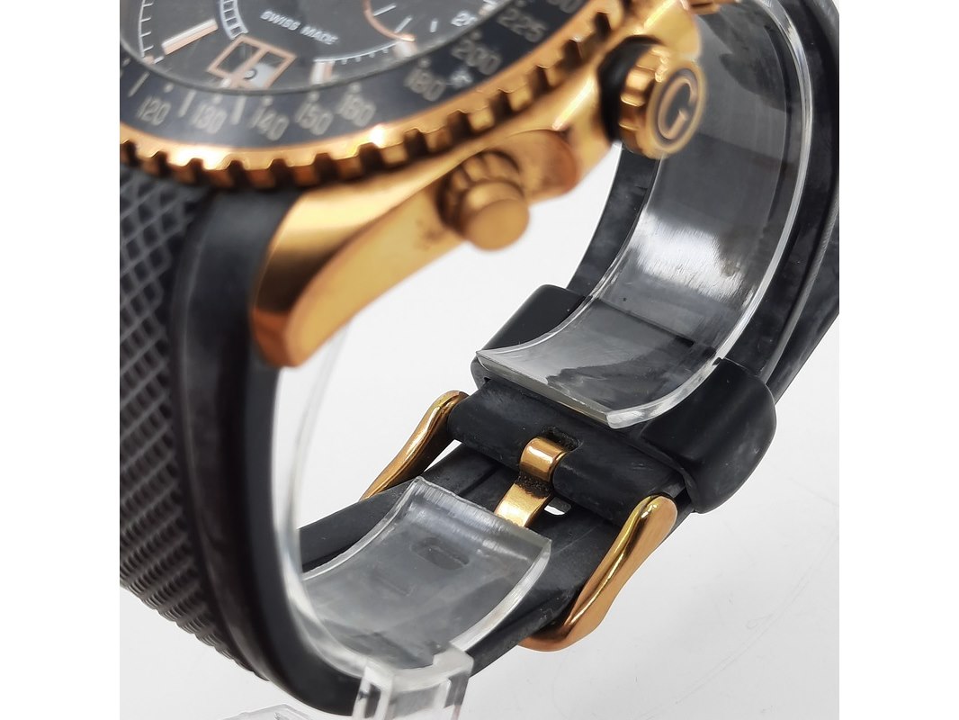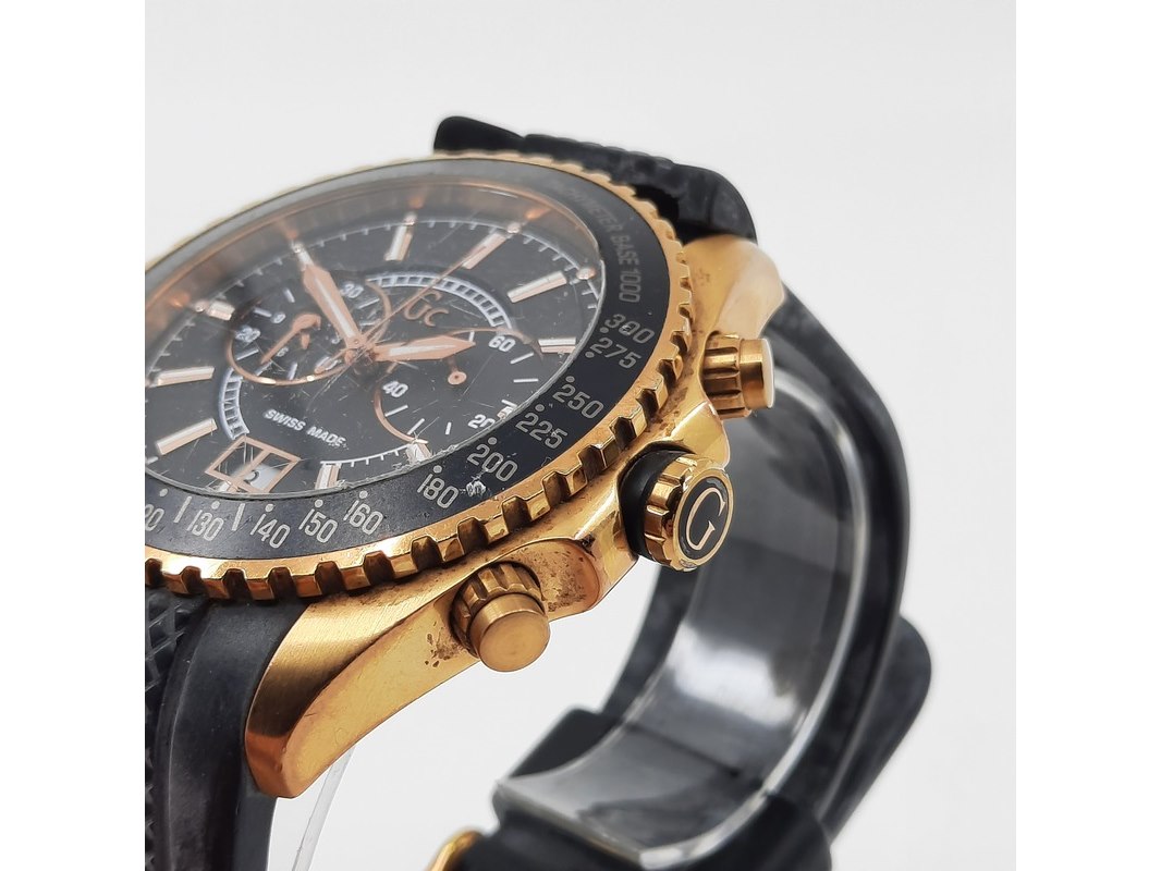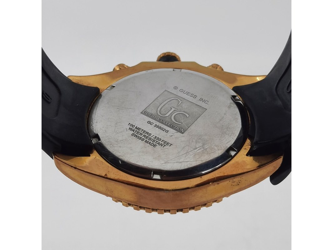 Merk: Guess Product: Heren polshorloge Specificaties: Een onedel heren polshorloge Guess, GC collection, GC 35502G, quartz chronograaf met rubber band. Let op, band gebroken. Geen doos en geen certificaat.