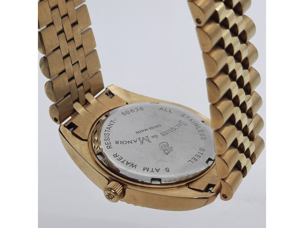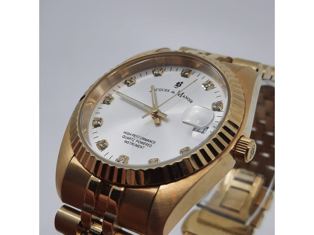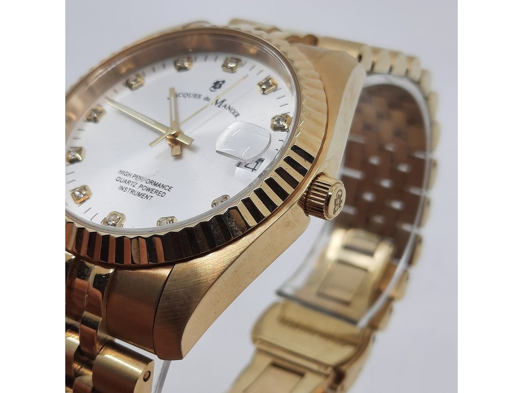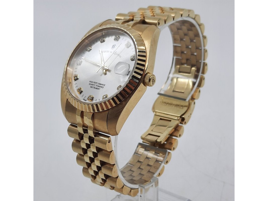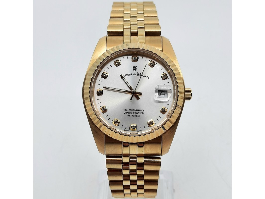 Merk: Jaques du Manoir Product: Heren polshorloge Conditie: gebruikt Specificaties: Een onedel polshorloge. Merk Jaques du Manoir, type quartz. Wijzerplaat bezet met simili. Geen doos en geen certificaat.