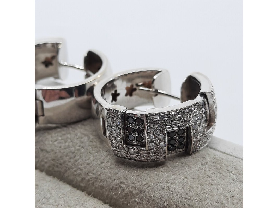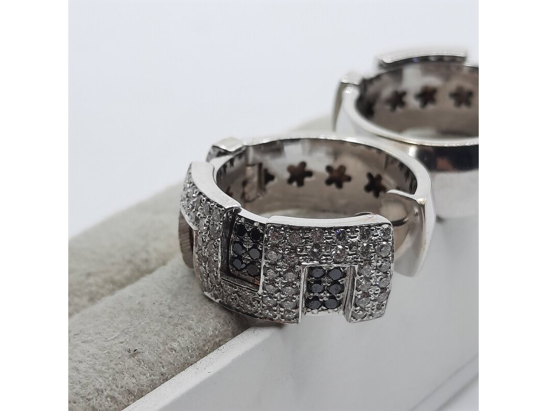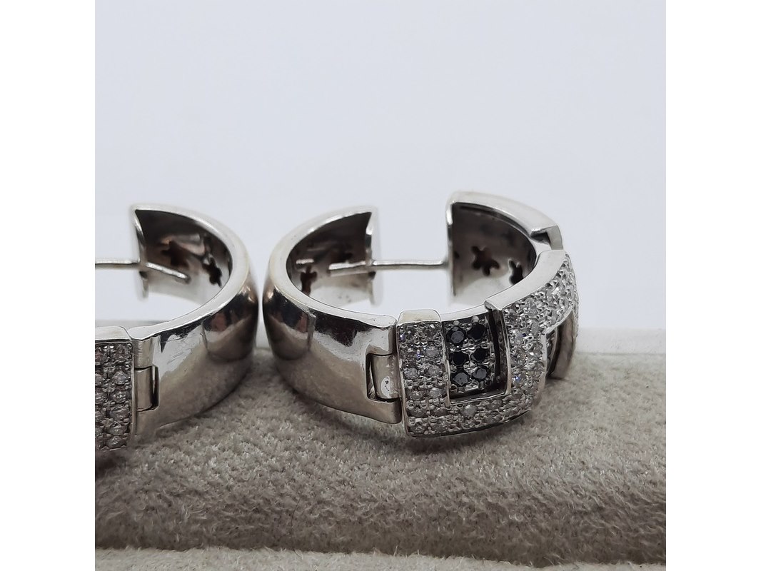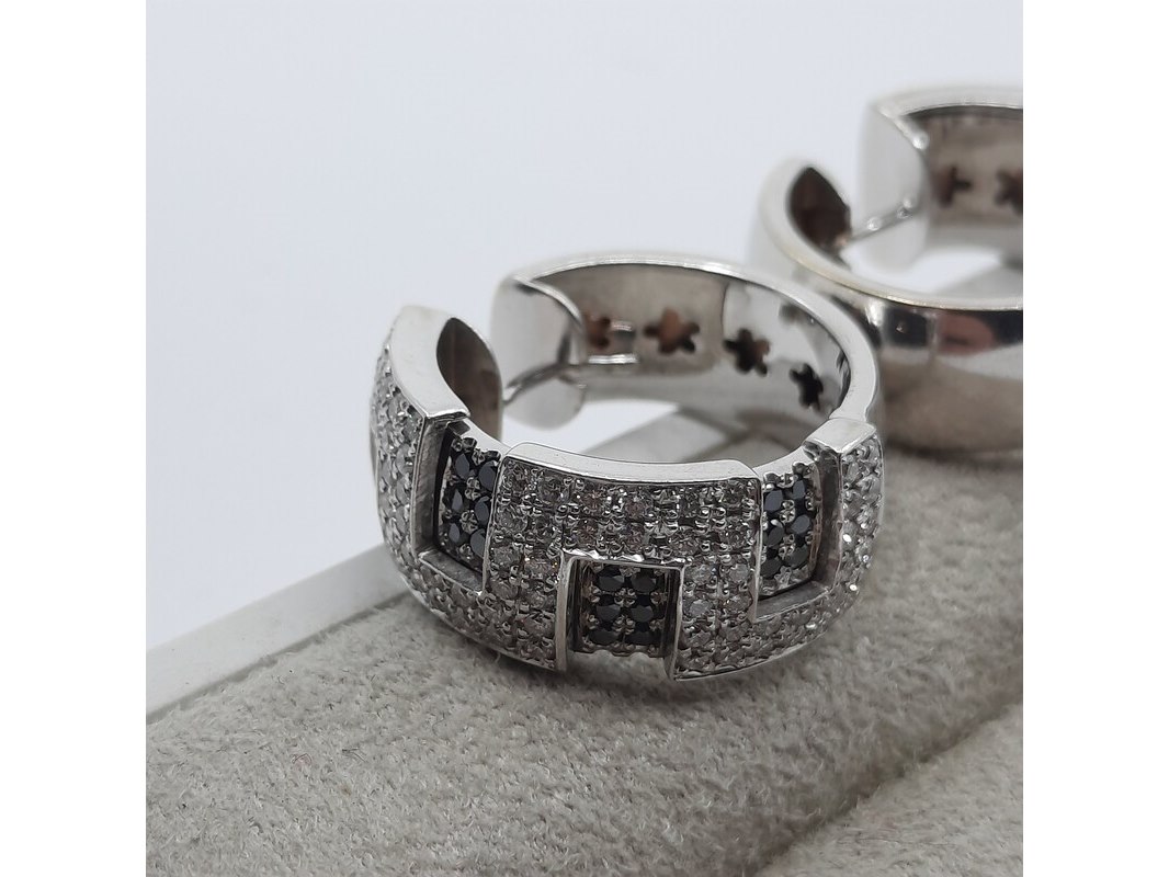 Product: Paar creolen, 18 karaats Conditie: Gebruikt Specificaties: Een paar 18 karaats witgouden creolen met ca. 1,5 kt. kleurloze en ca. 0,45 kt. zwarte diamant. Gewicht samen ca. 25,45 gram