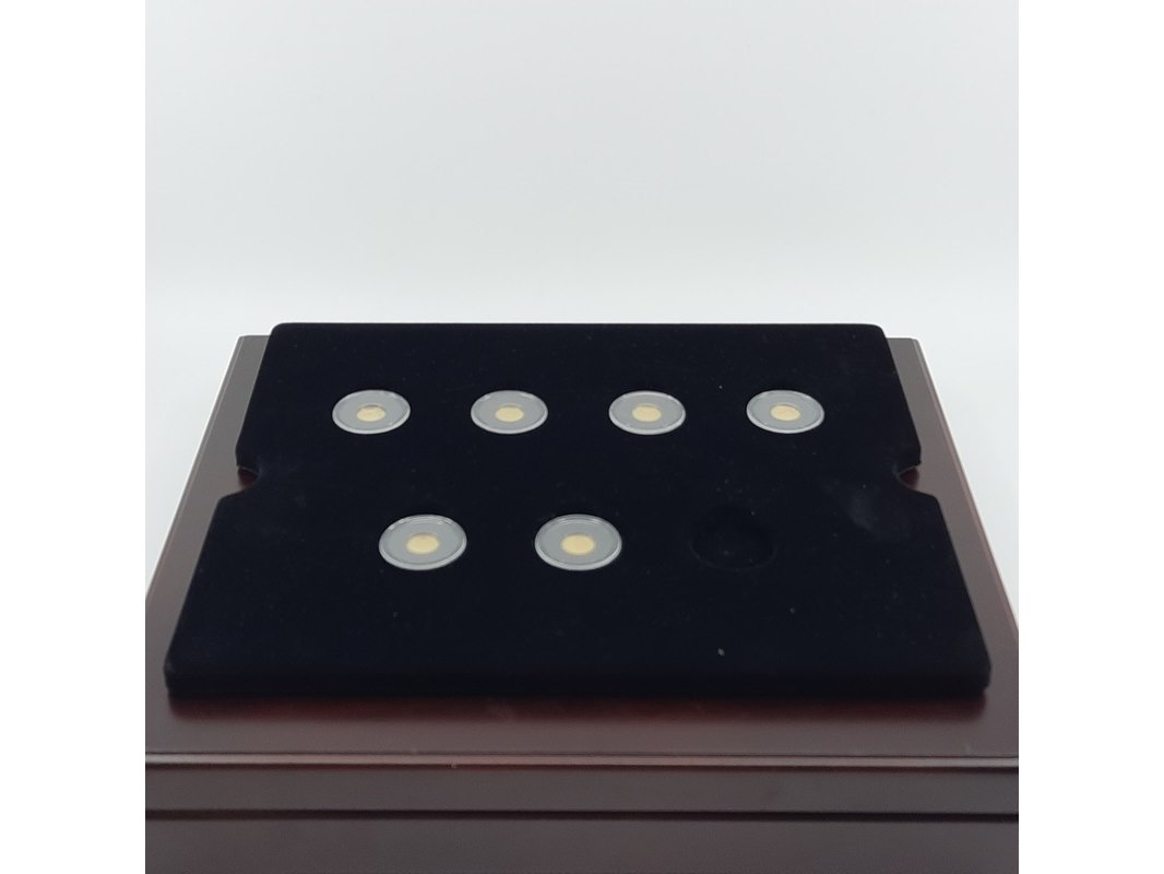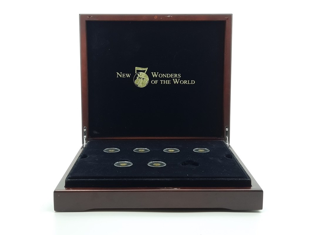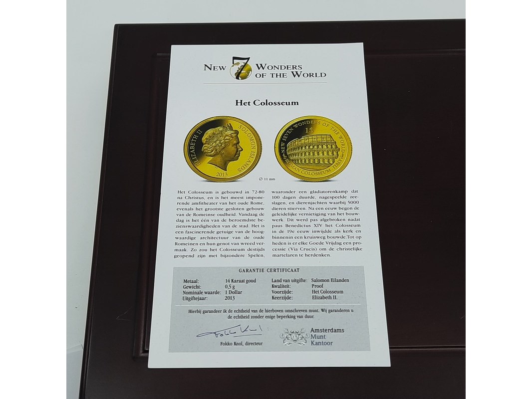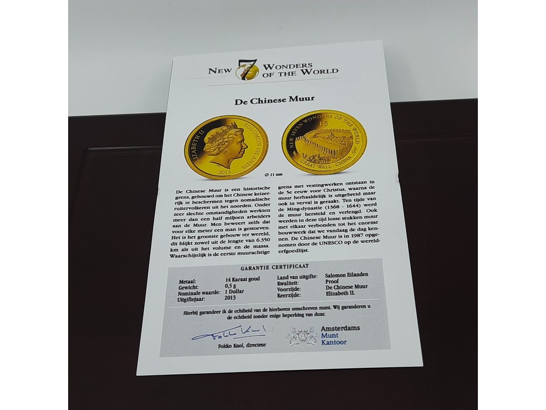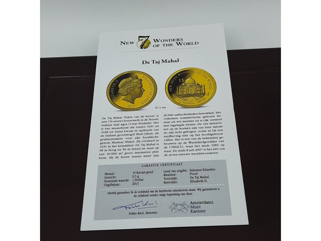 Product: Munt, 14 karaats Conditie: Gebruikt Specificaties: 13x geelgouden munt à 0,5 gram (14krt). Uit serie New 7 Wonders of the World. Met 9x certificaat, in houten doosje.