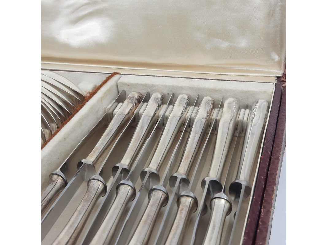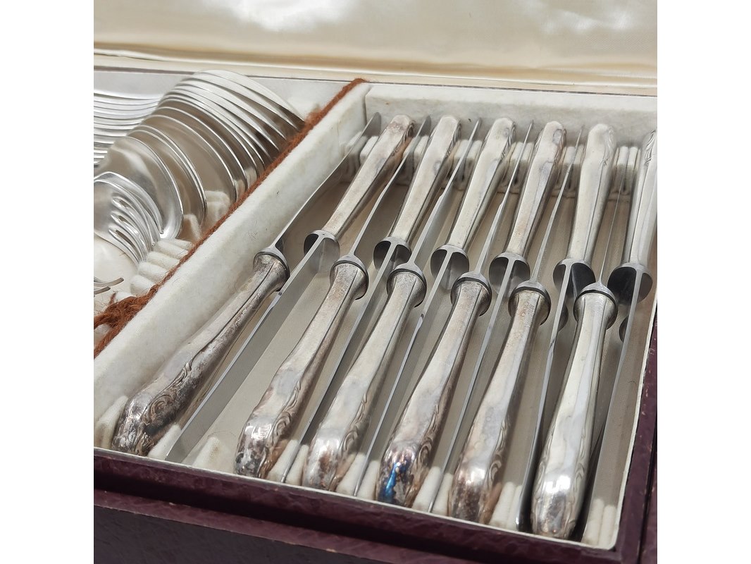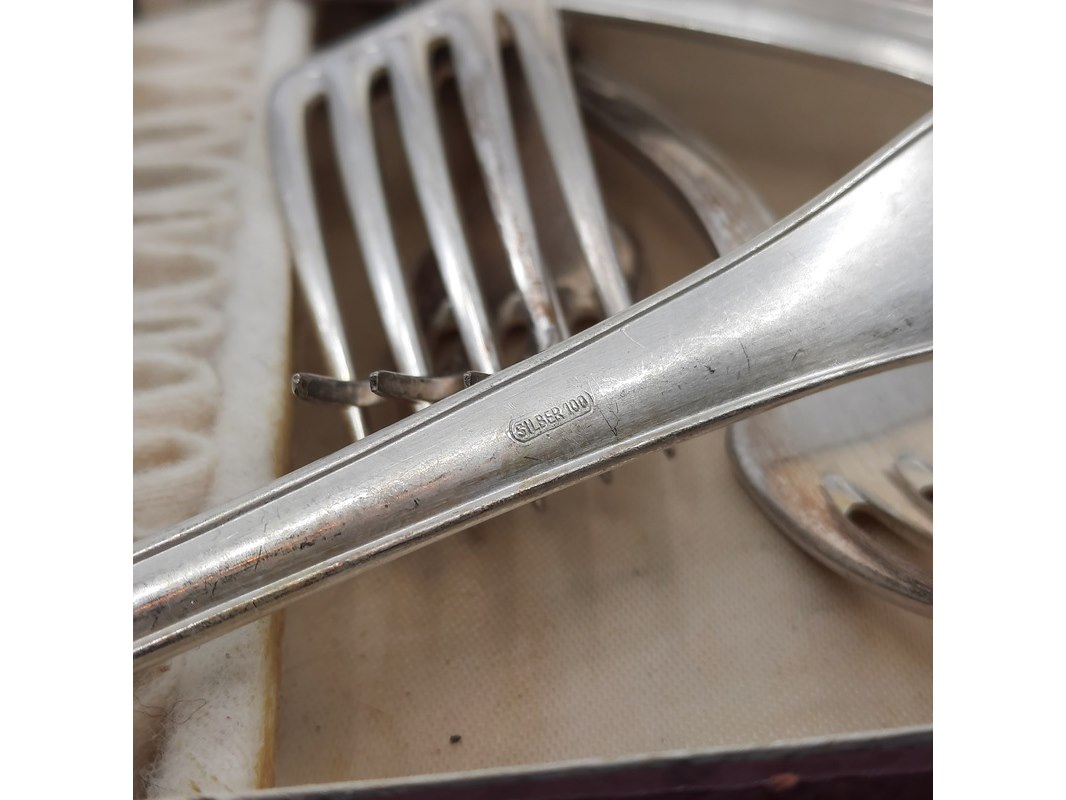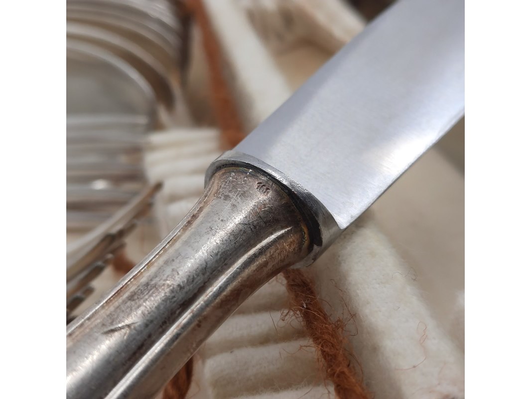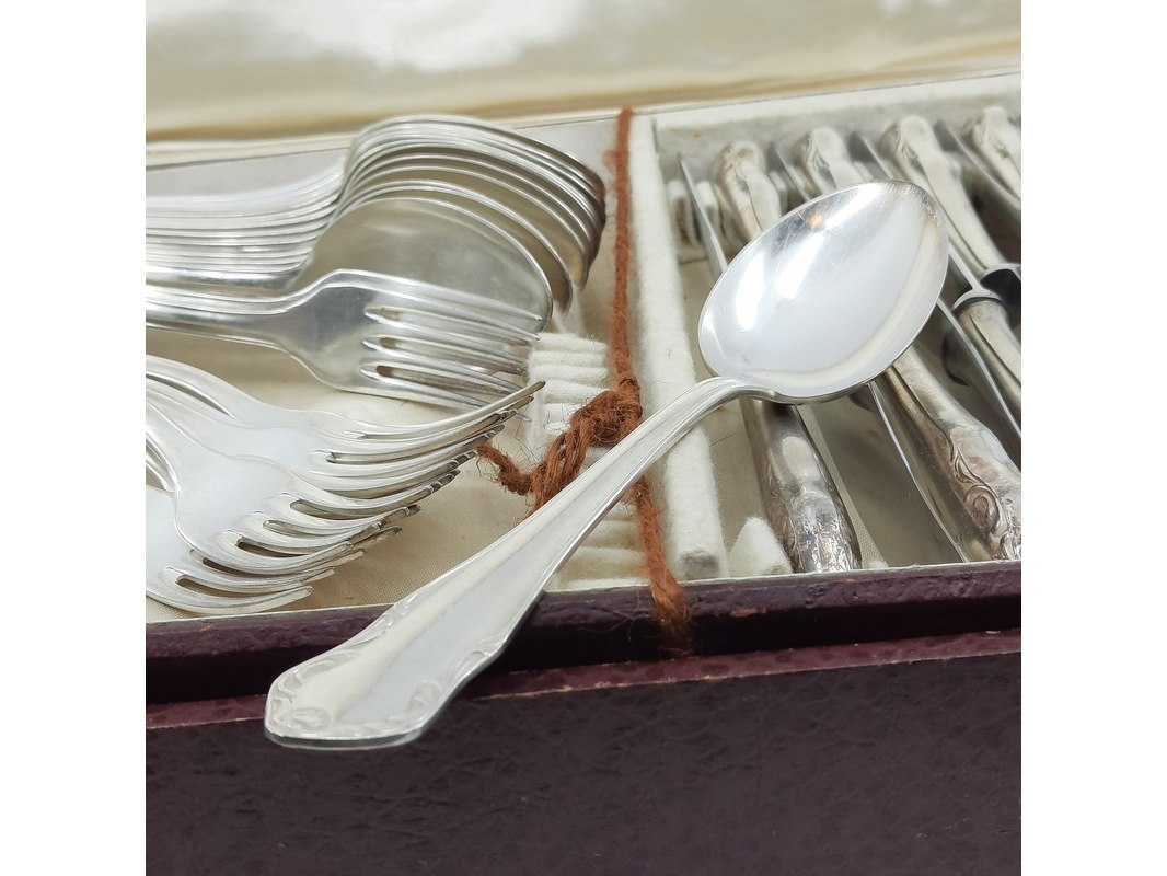Product: Casette met verzilverd bestek Conditie: Gebruikt Specificaties: Verzilverd bestek. Duitse makelij. In doos, deksel defect. Doos beschadigd