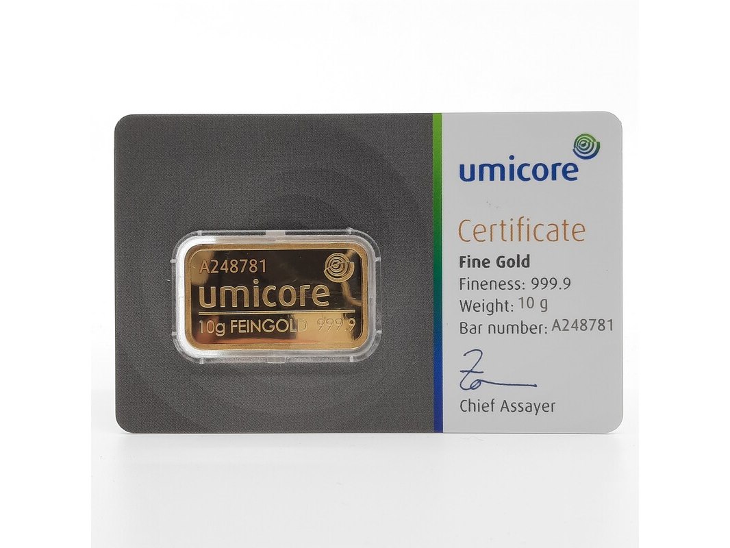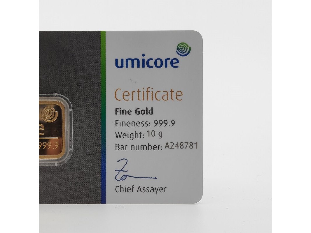 Merk: Umicore Product: Goudbaar, 10 gram Conditie: Gebruikt Specificaties: Goudbaar 10 gram, Umicore.