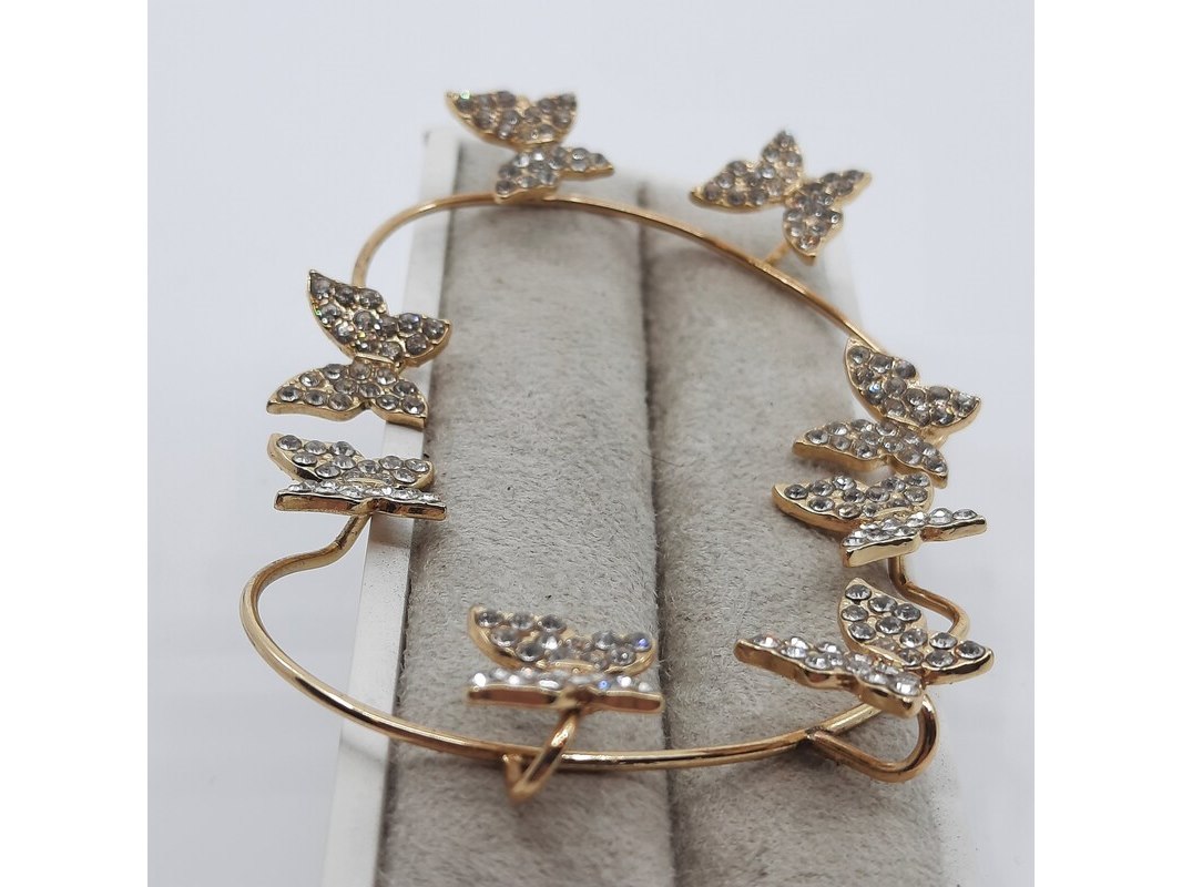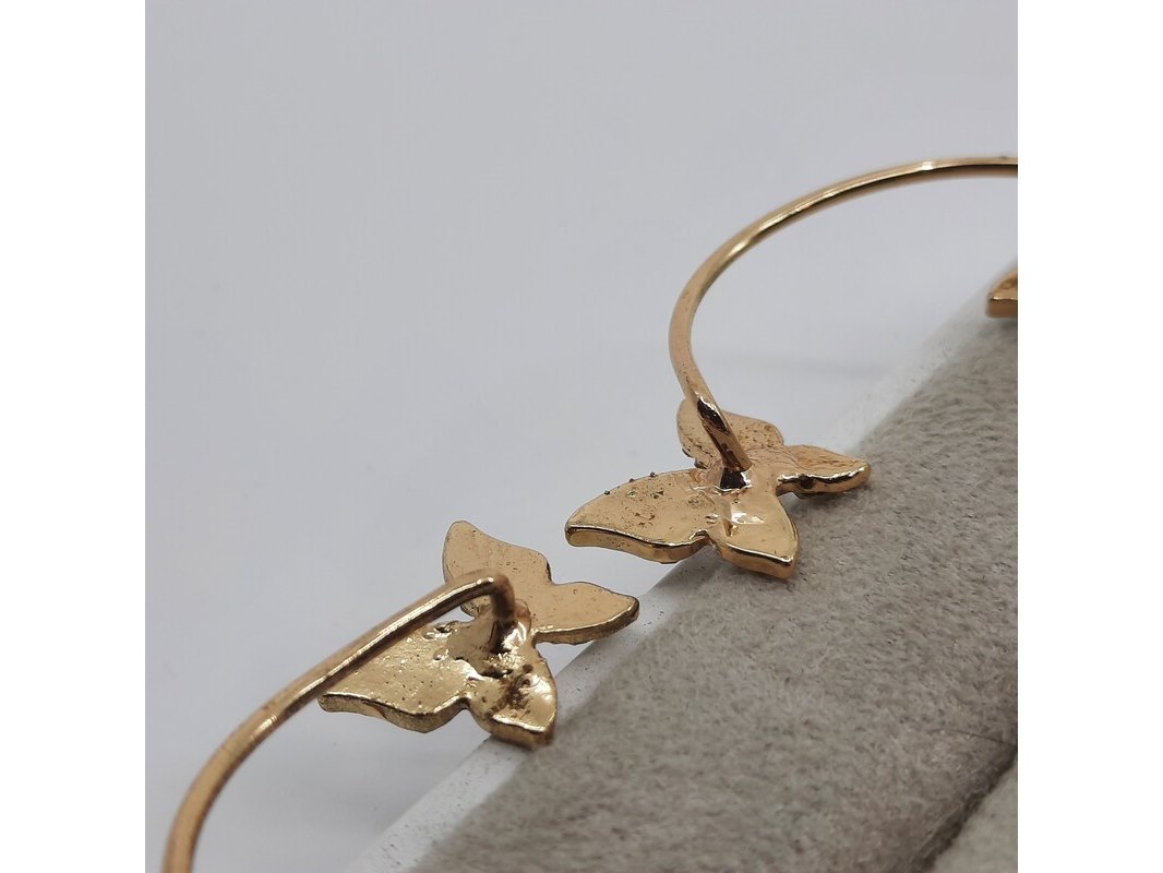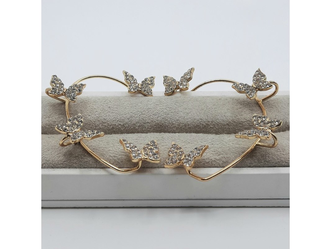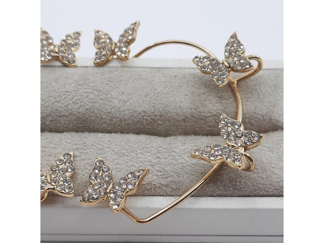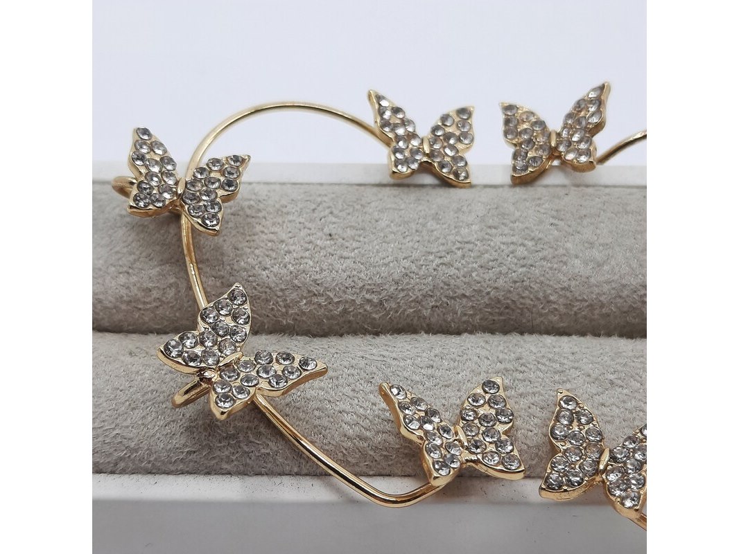 Merk: Louis Vuitton Product: Paar oorsieraden Conditie: Gebruikt Specificaties: Een paar onedele oorsieraad, vlindermotief, bezet met simili. Merk Louis Vuitton.