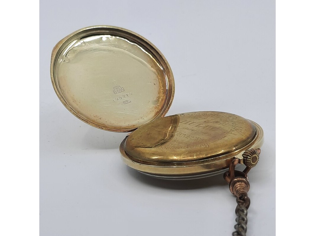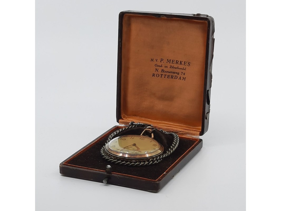 Product: Zakhorloge Conditie: Gebruikt Specificaties: Een zakhorloge met geelgouden kast, aan onedele horlogeketting. In doosje