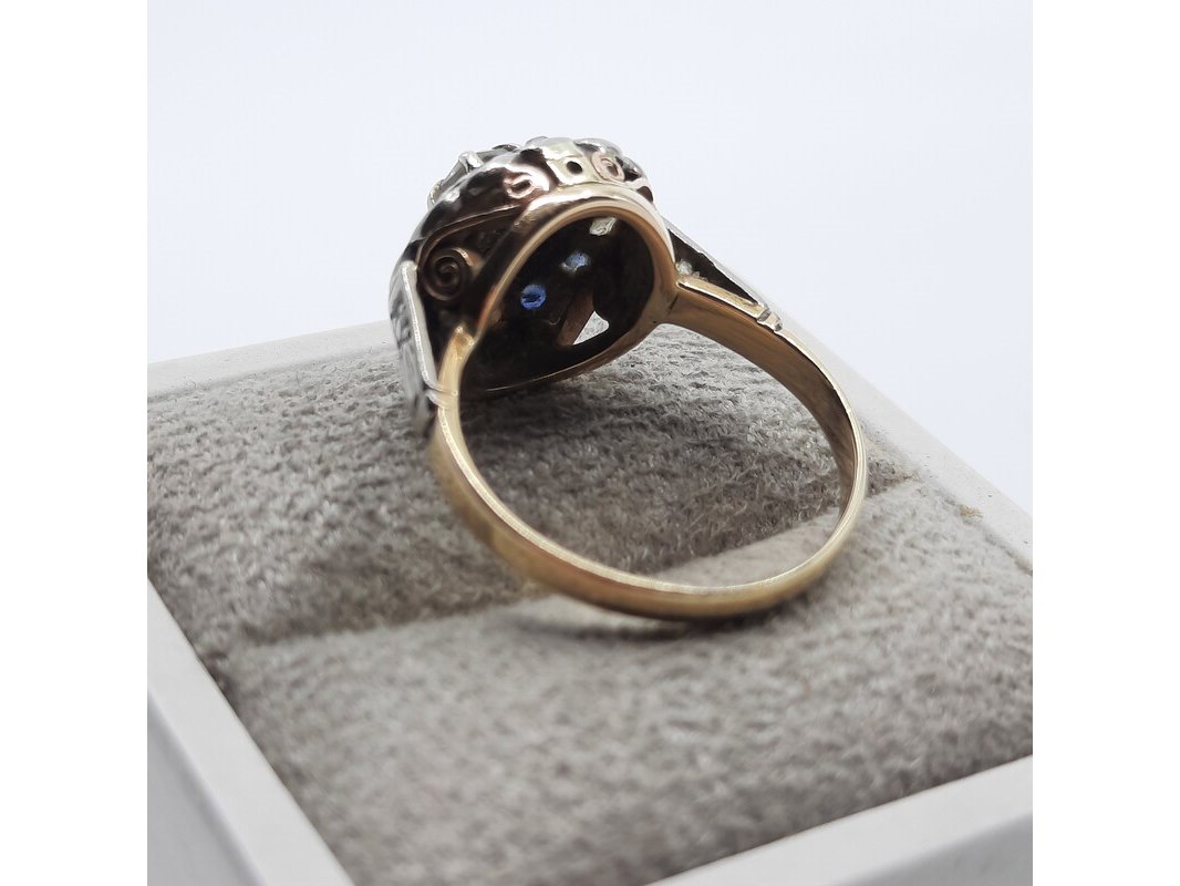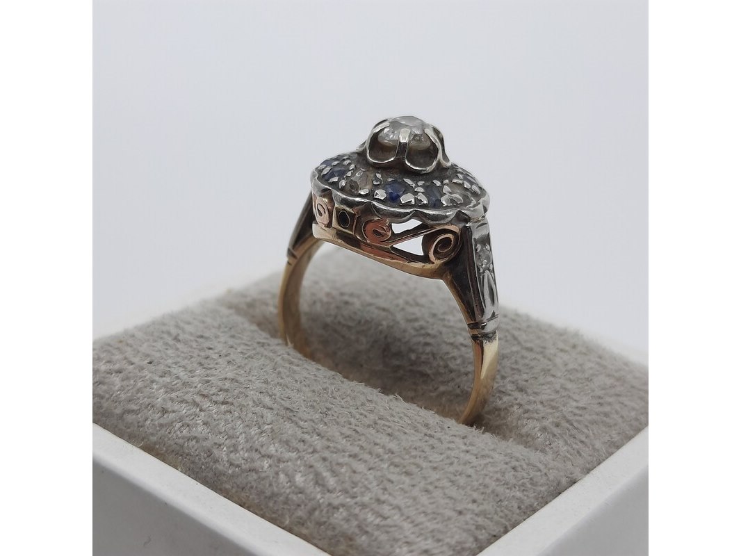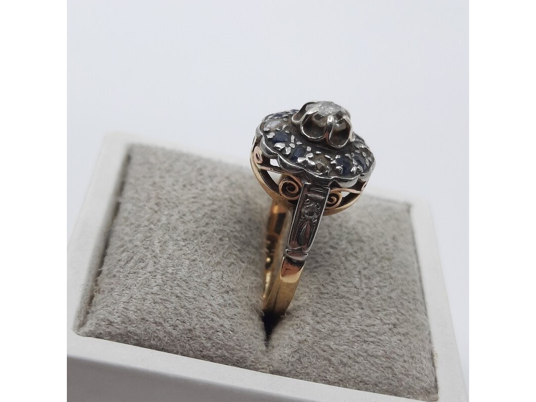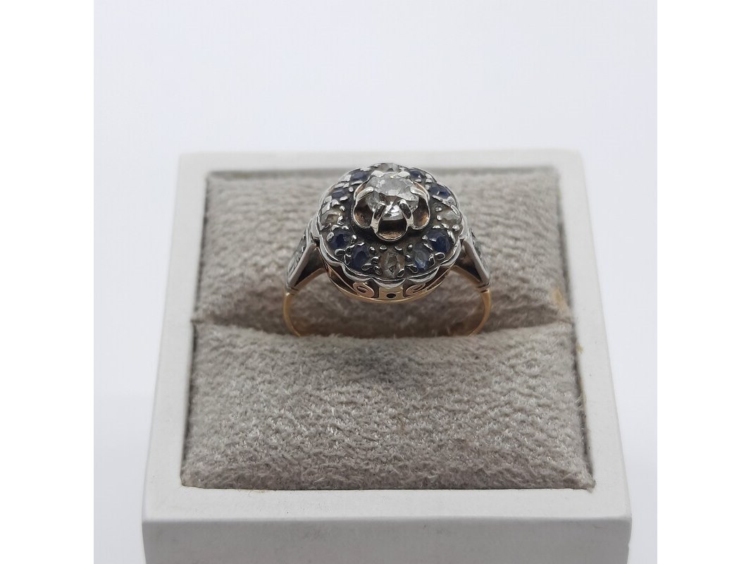 Product: Ring Afmeting: Ringmaat ca. 16 (52) Conditie: Gebruikt Specificaties: Een geelgouden entourage ring. Bezet met oud-briljant geslepen diamanten en saffieren. Gewicht ca. 3,72 gram