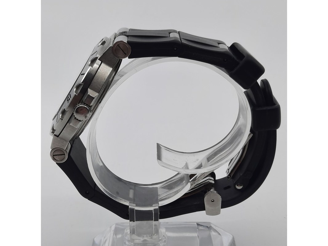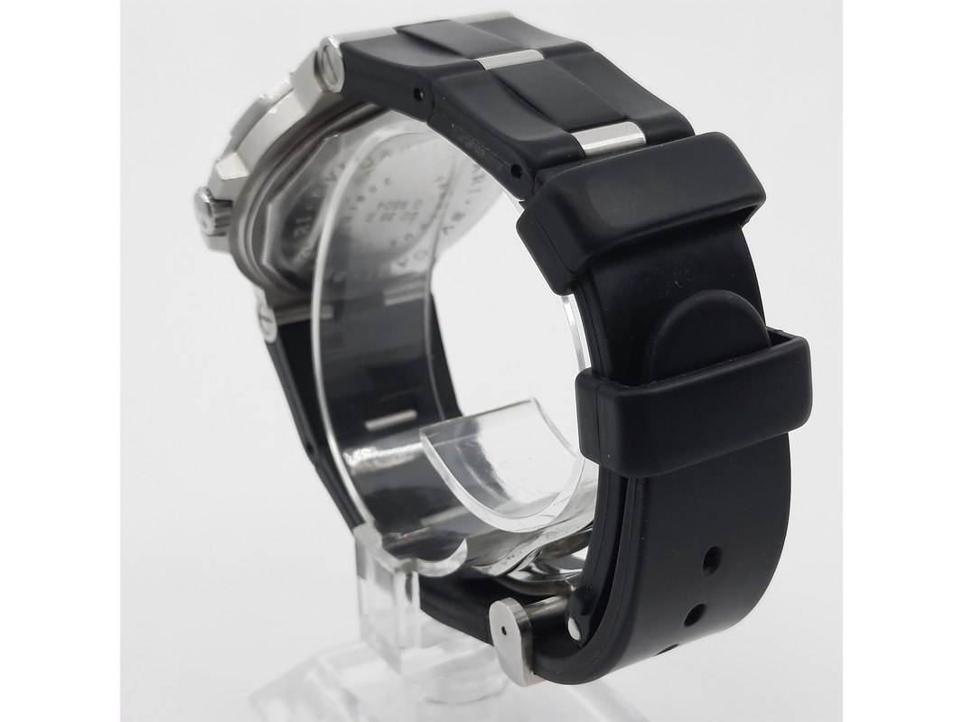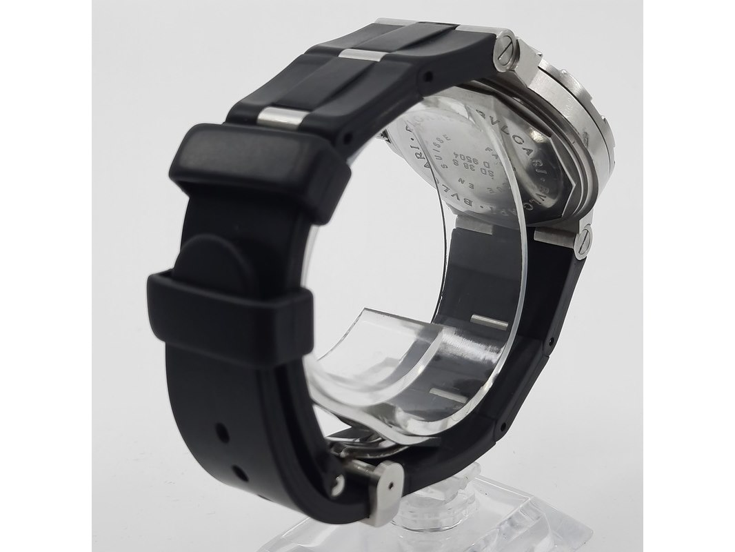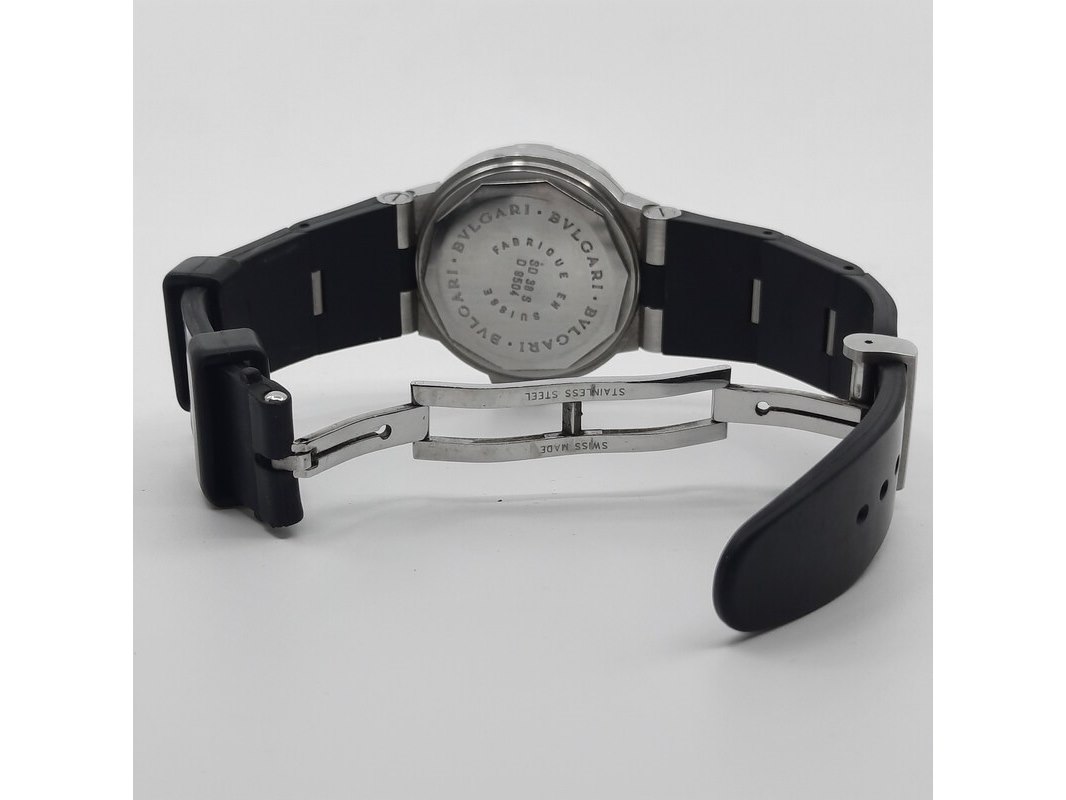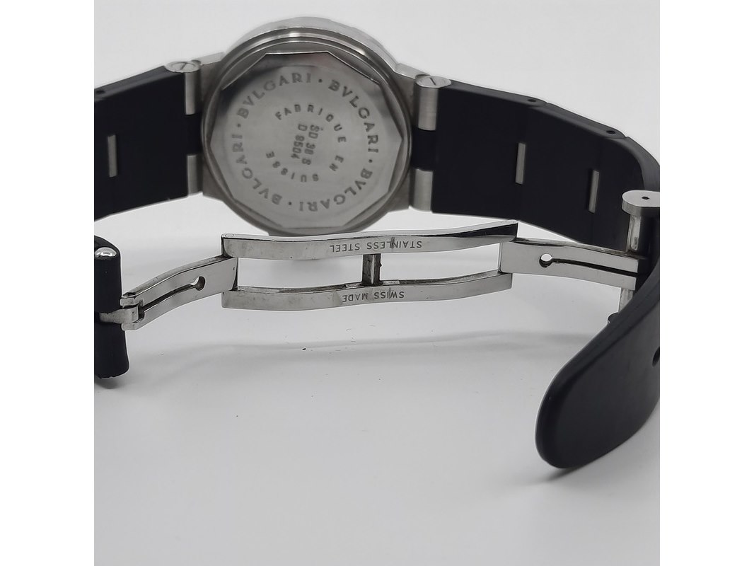 Merk: Bulgari Product: Heren polshorloge Conditie: Gebruikt Specificaties: Een stalen polshorloge met zwarte wijzerplaat, Bulgari Diagono. Aan gesegmenteerde rubber band met dubbele vouwsluiting. Geen doos en geen certificaat.