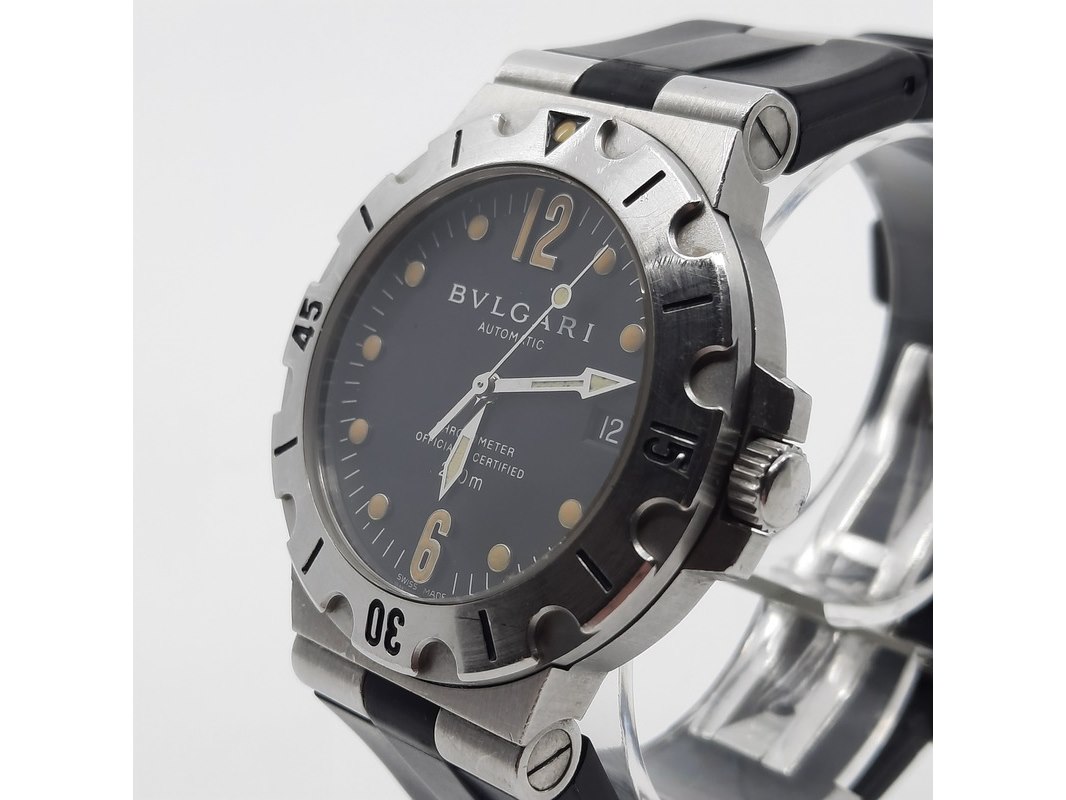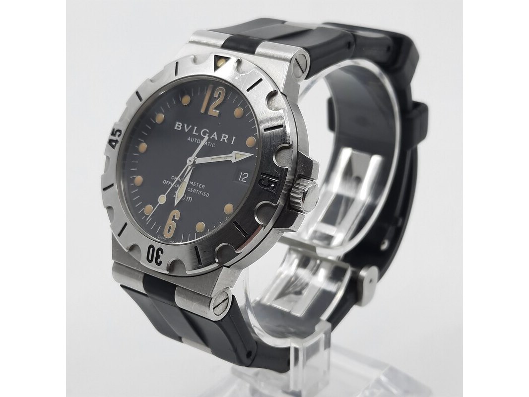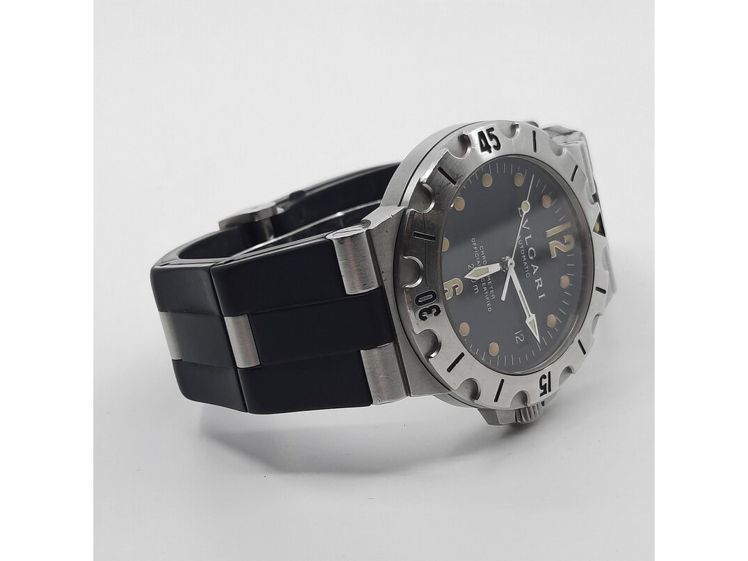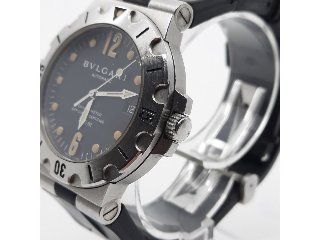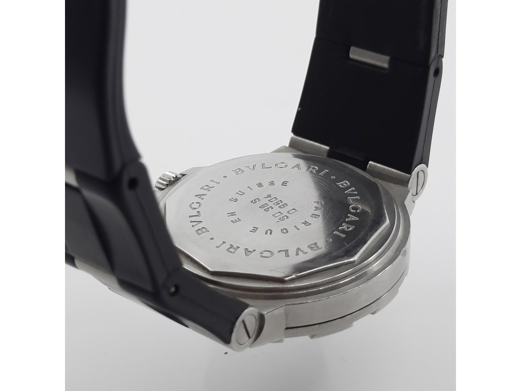 Merk: Bulgari Product: Heren polshorloge Conditie: Gebruikt Specificaties: Een stalen polshorloge met zwarte wijzerplaat, Bulgari Diagono. Aan gesegmenteerde rubber band met dubbele vouwsluiting. Geen doos en geen certificaat.