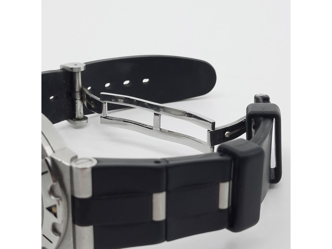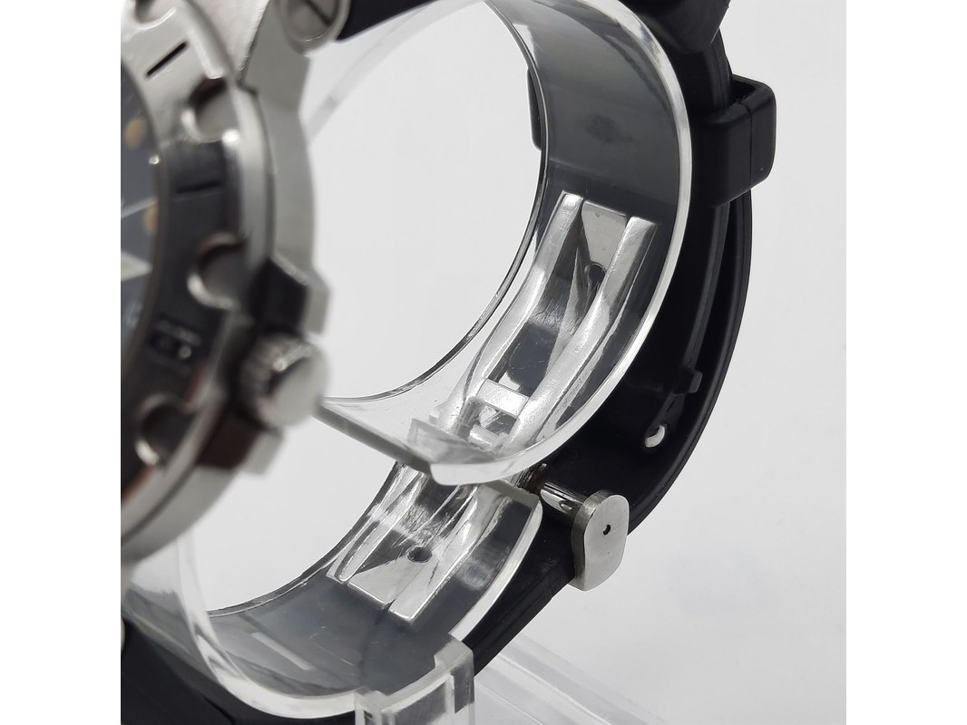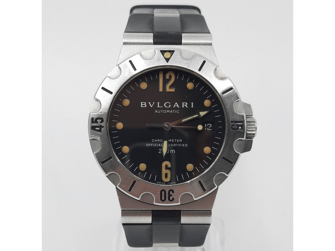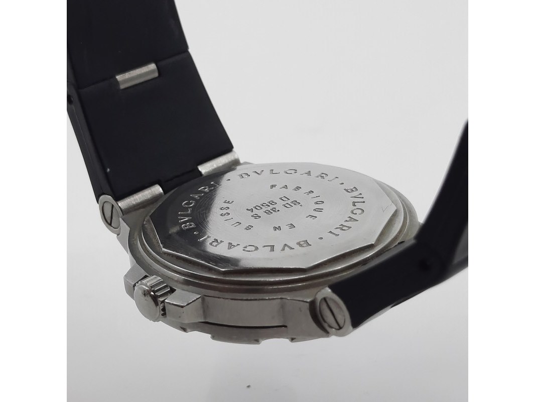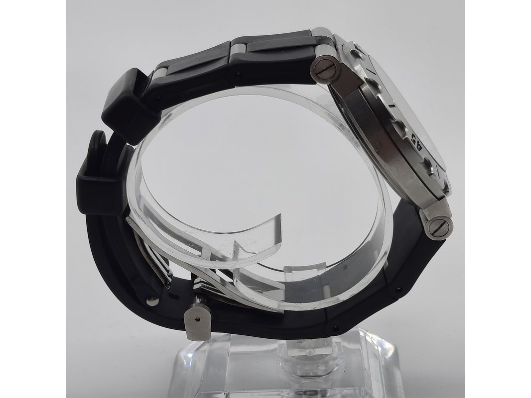 Merk: Bulgari Product: Heren polshorloge Conditie: Gebruikt Specificaties: Een stalen polshorloge met zwarte wijzerplaat, Bulgari Diagono. Aan gesegmenteerde rubber band met dubbele vouwsluiting. Geen doos en geen certificaat.