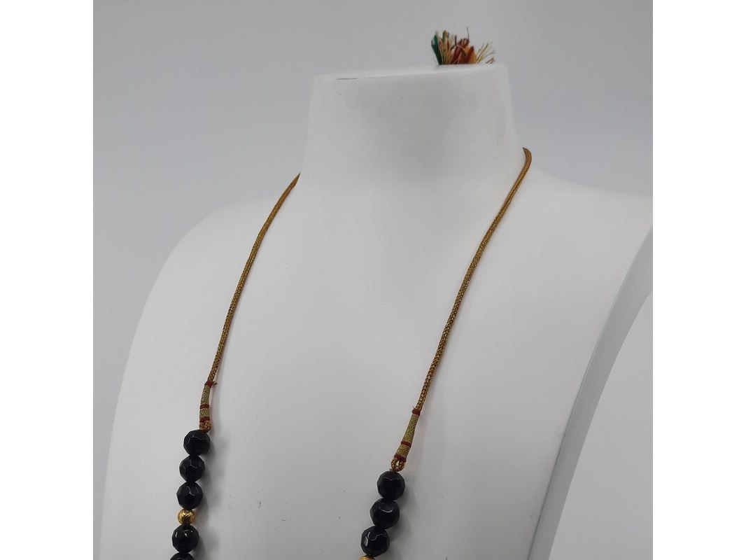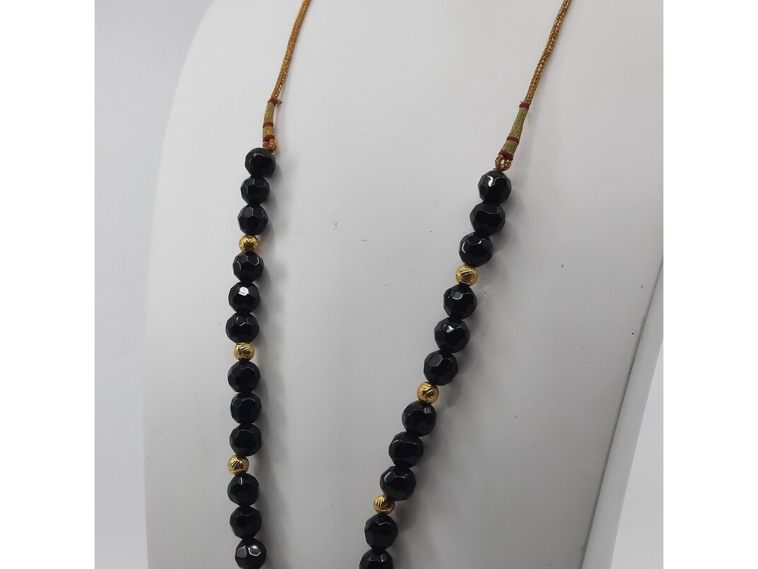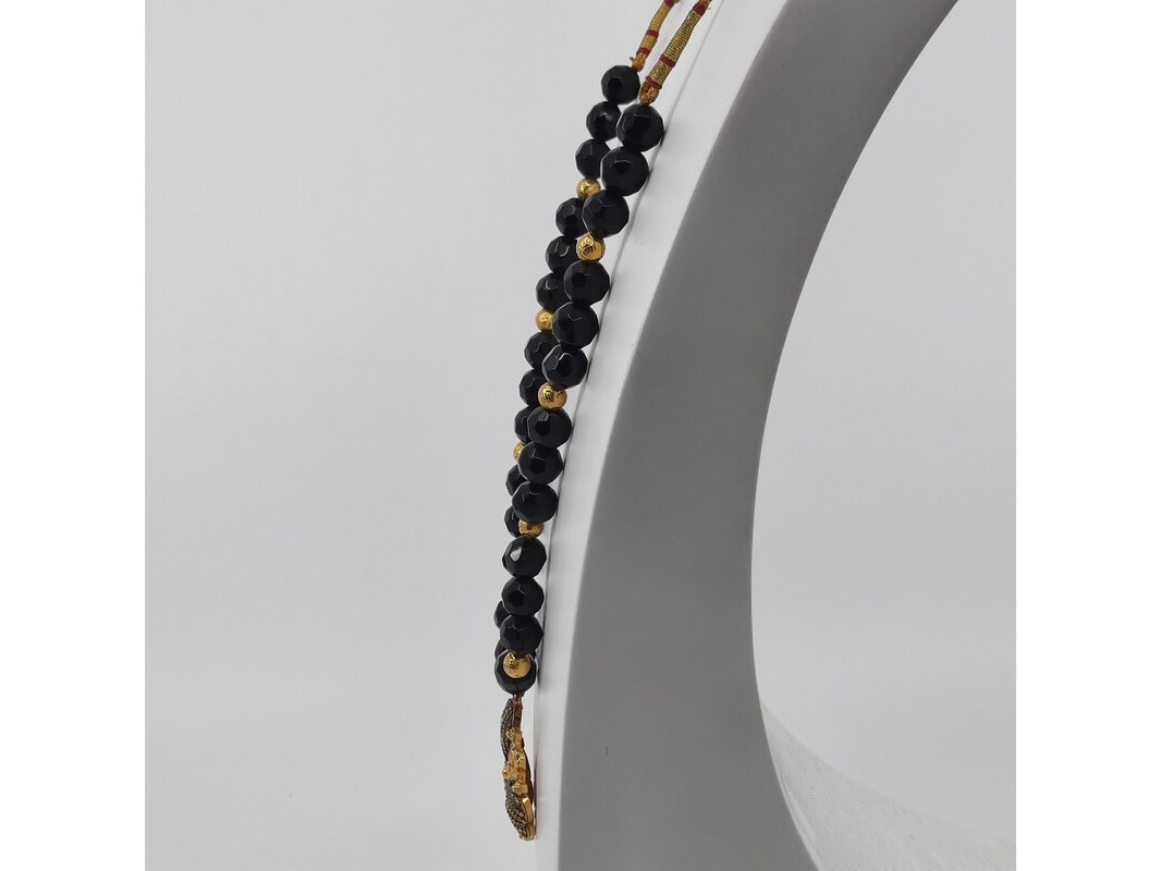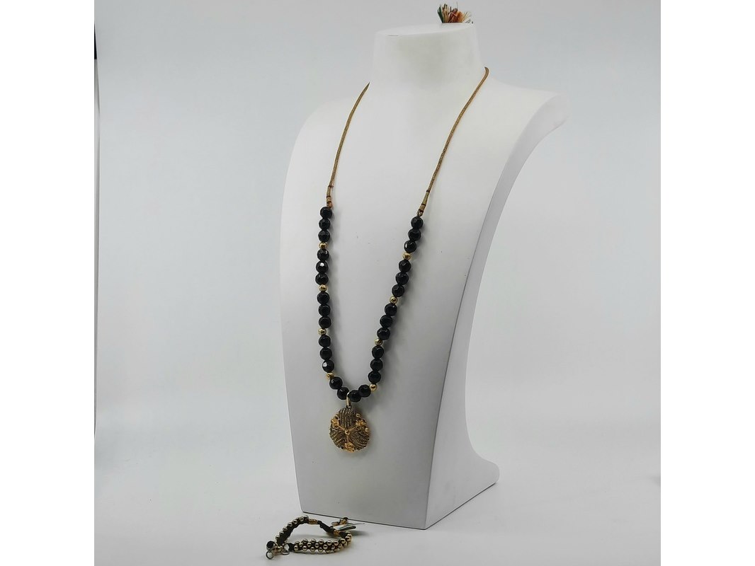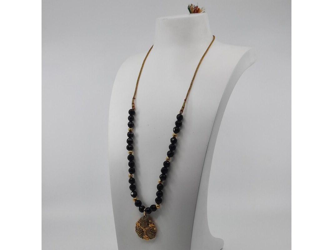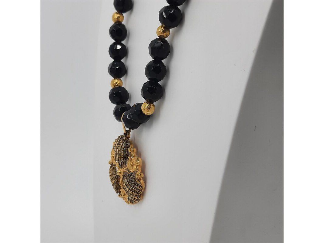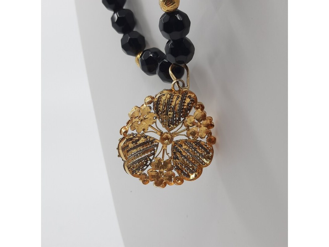 Product: Glaskralen collier Afmeting: Lengte ca. 80 cm. Conditie: Gebruikt Specificaties: Een glaskralen collier met 20 karaats geelgouden kralen, 20 karaats filigrein hanger en een paar verlengstukken, zilver met 20 karaats geelgouden bolletjes.