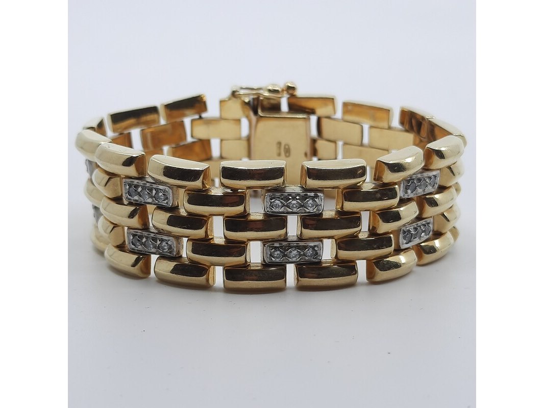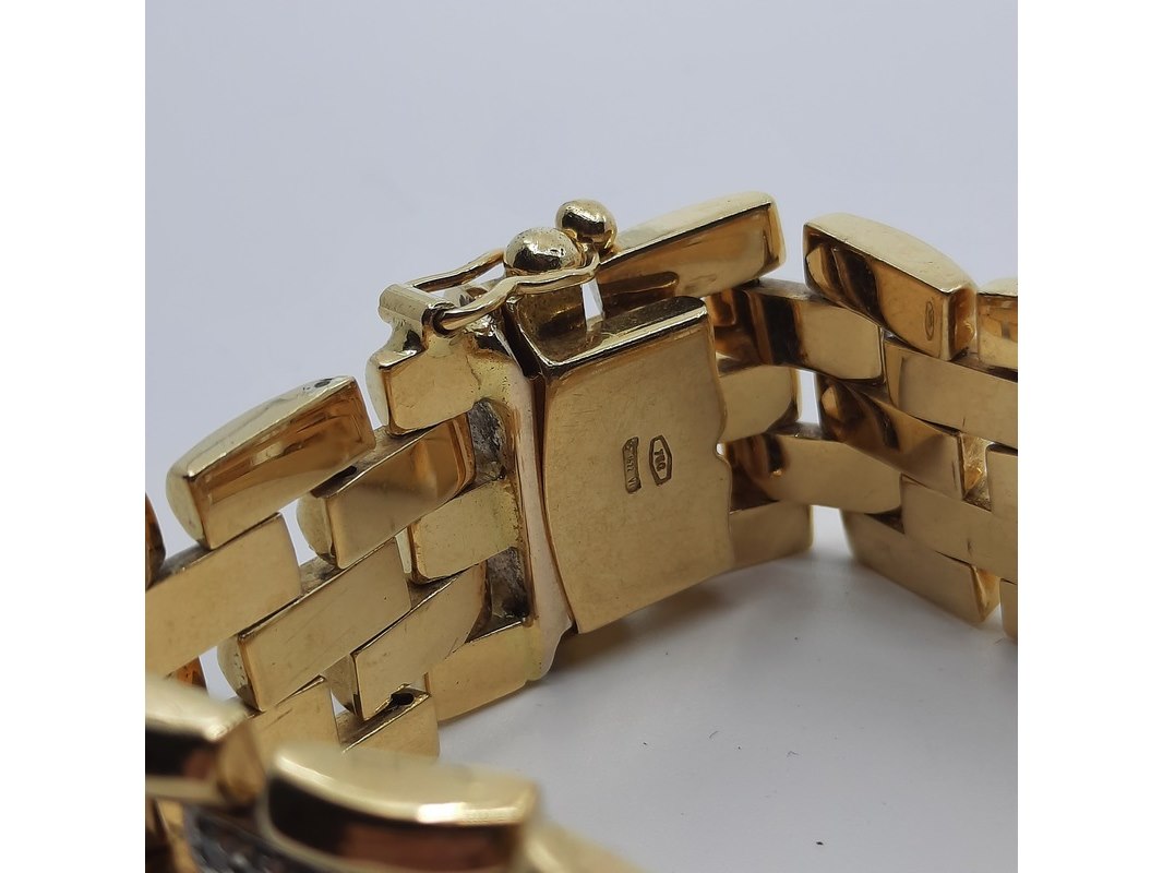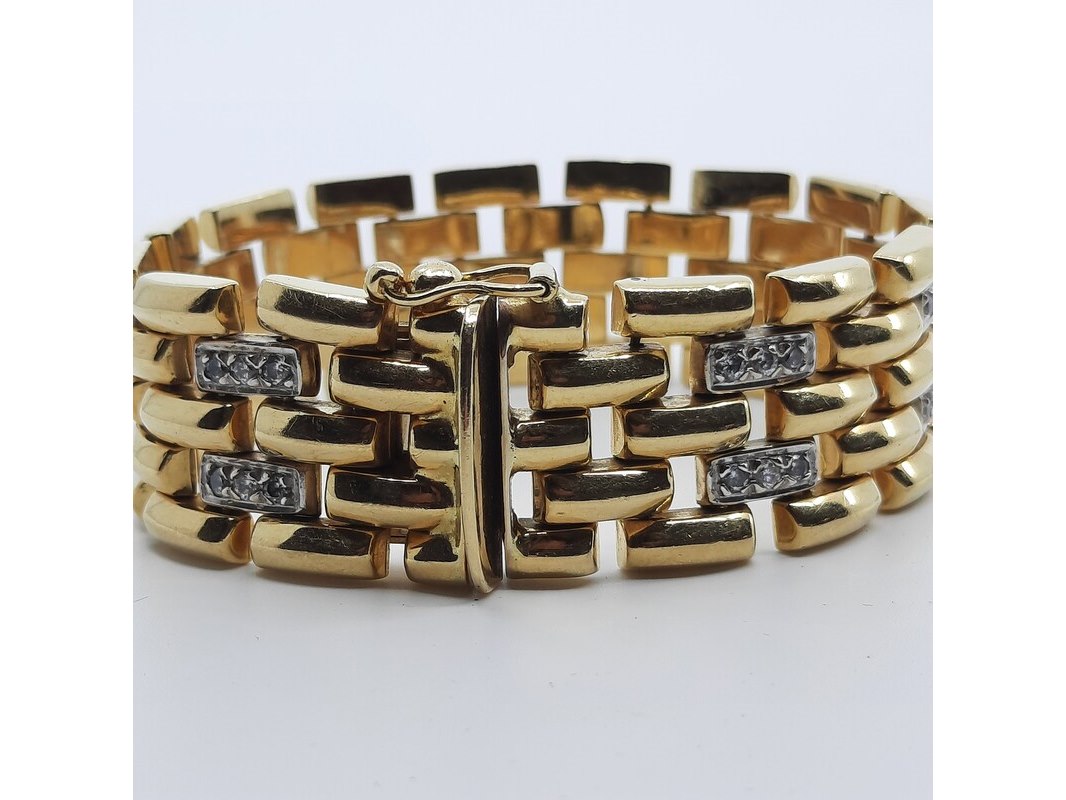Product: Armband, 18 karaats Afmeting: Lengte ca. 17 cm. Conditie: Gebruikt Specificaties: Een 18 karaats geelgouden armband met zirkonia. Gewicht ca. 52 gram.