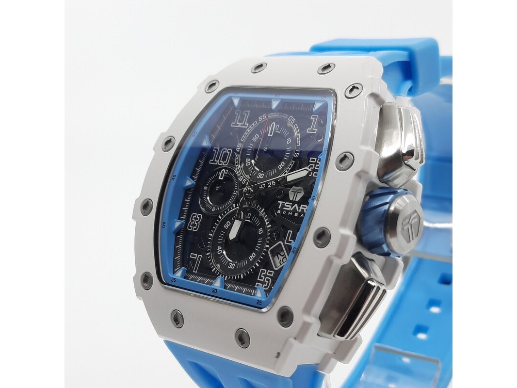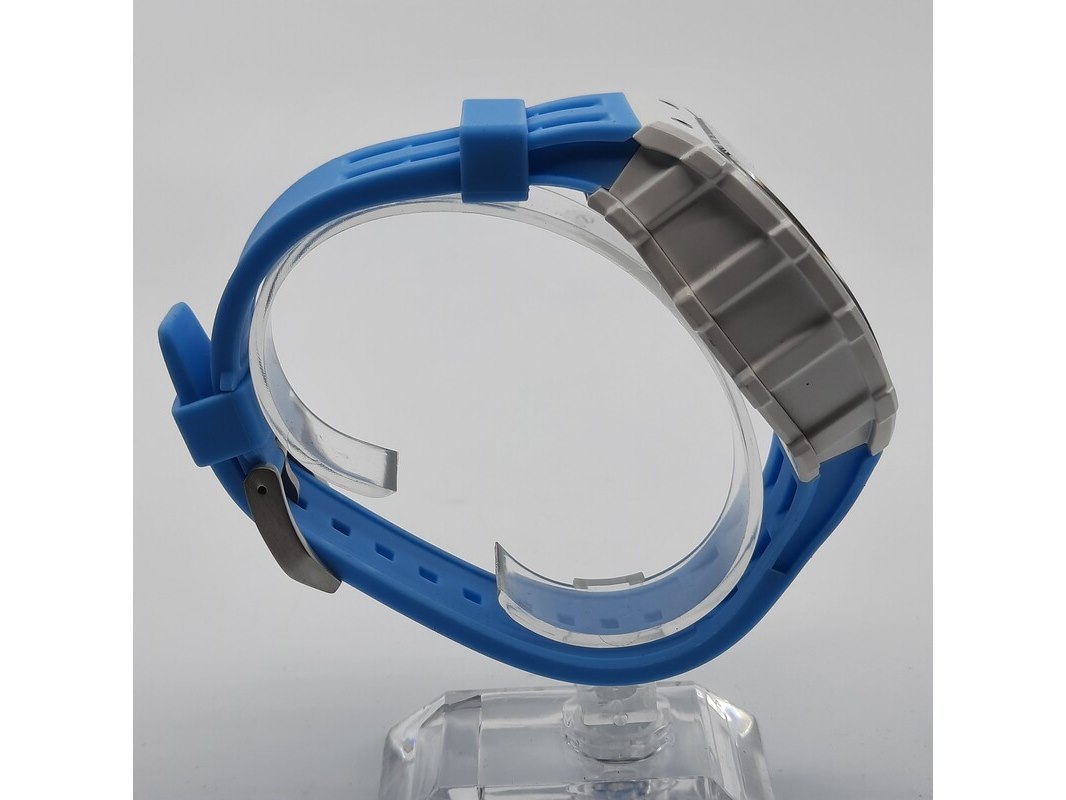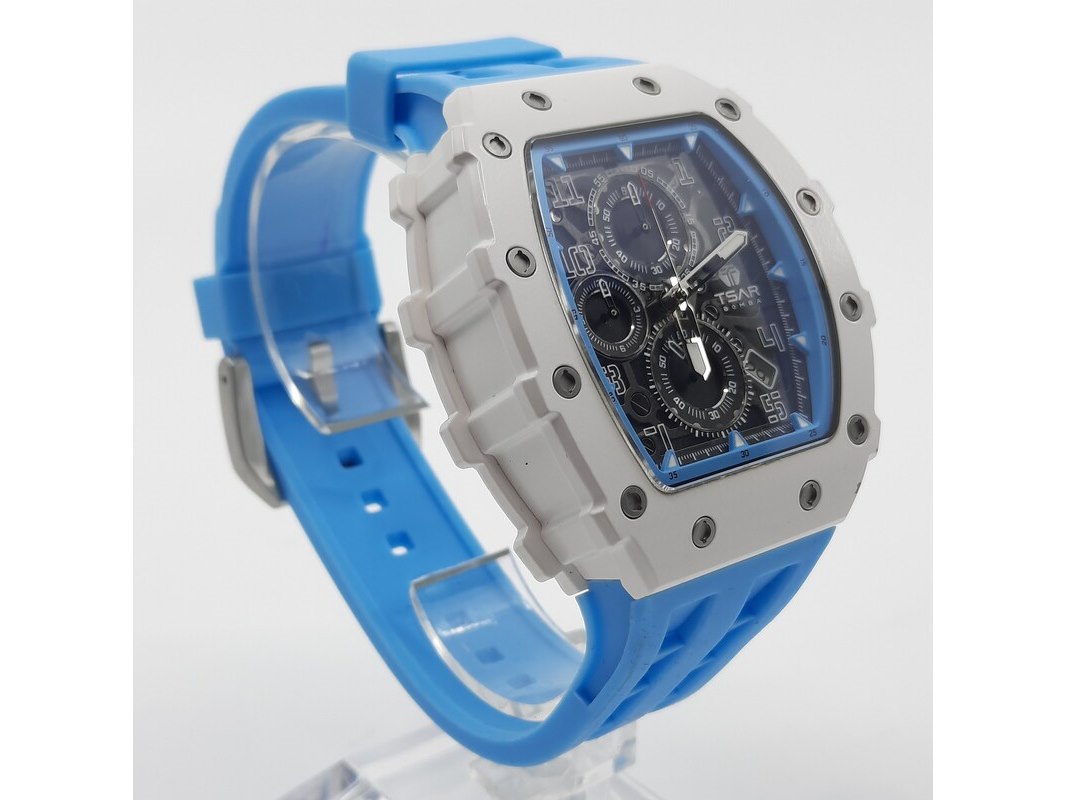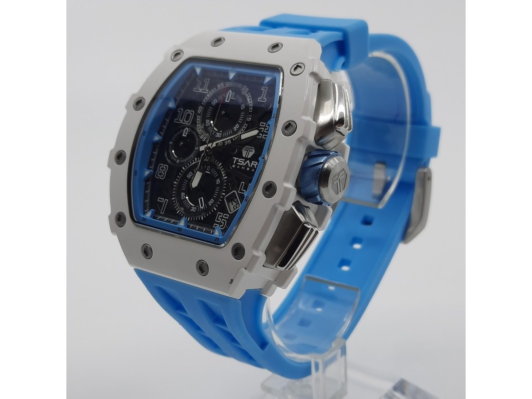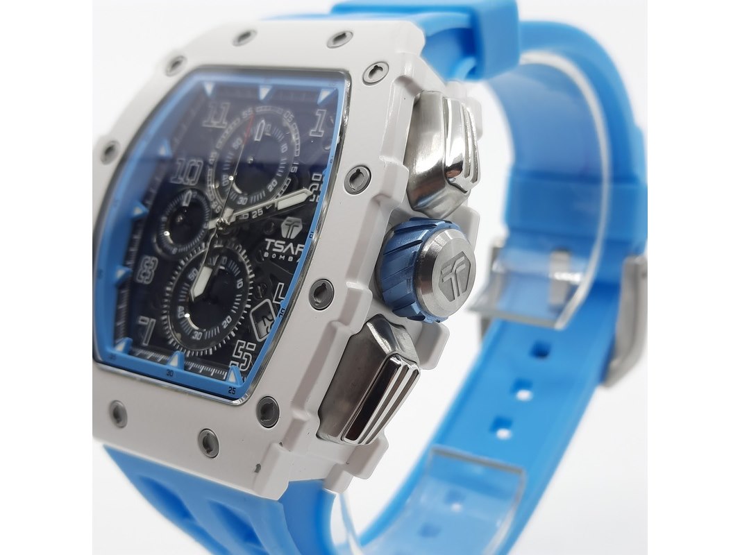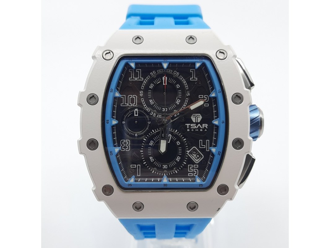 Merk: Tsar Product: Heren polshorloge Conditie: Gebruikt Specificaties: Een onedel heren polshorloge, Tsar Bomba, chronograaf, witte kunststof kast aan blauw kunststof band. Geen doos en geen certificaat.