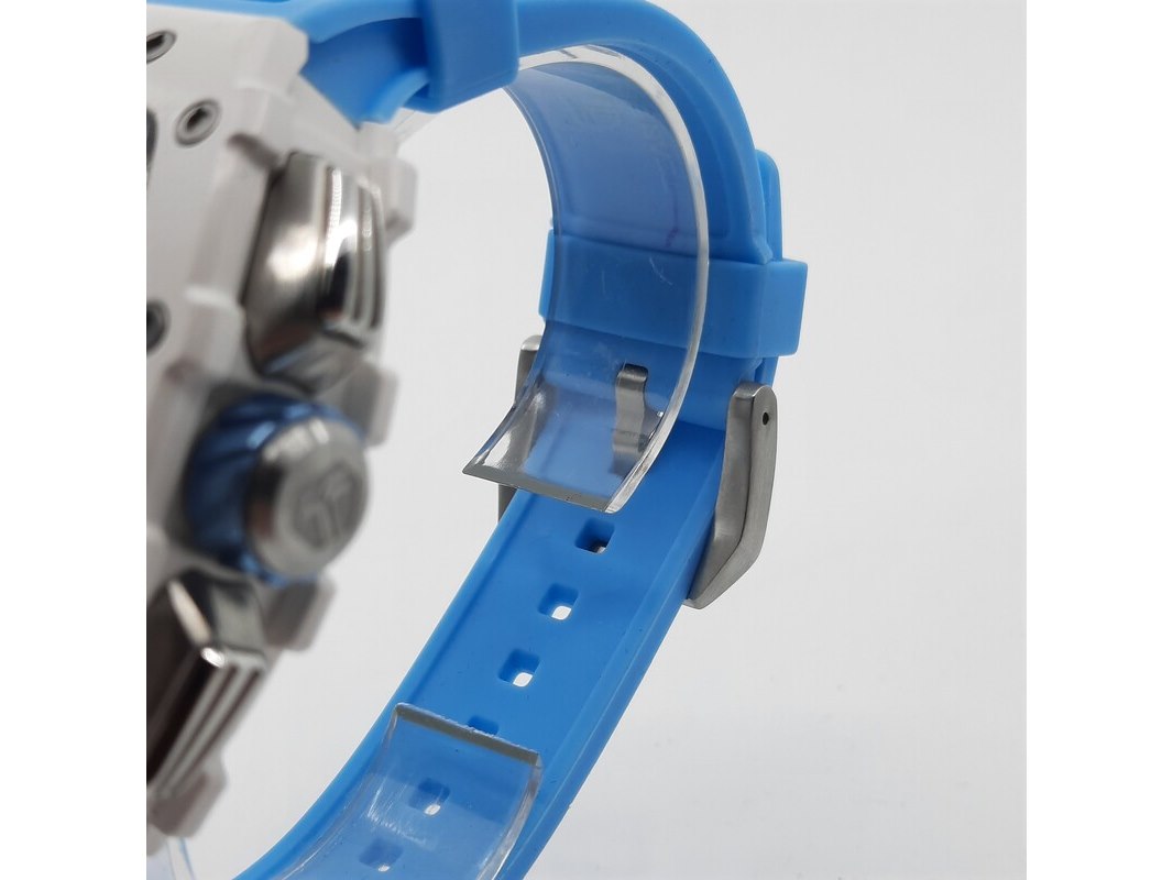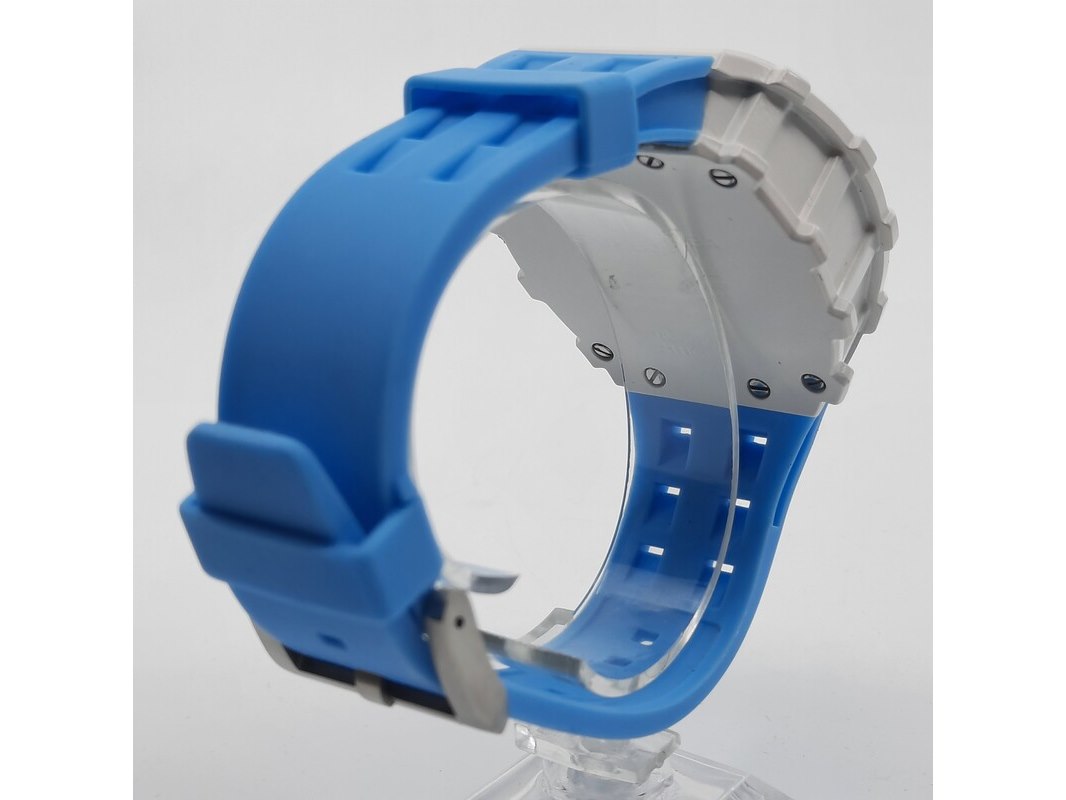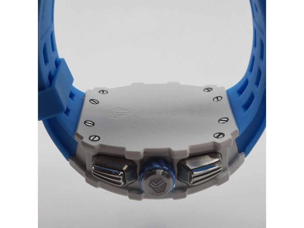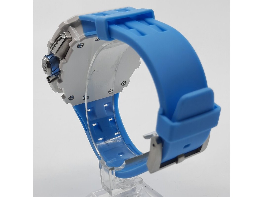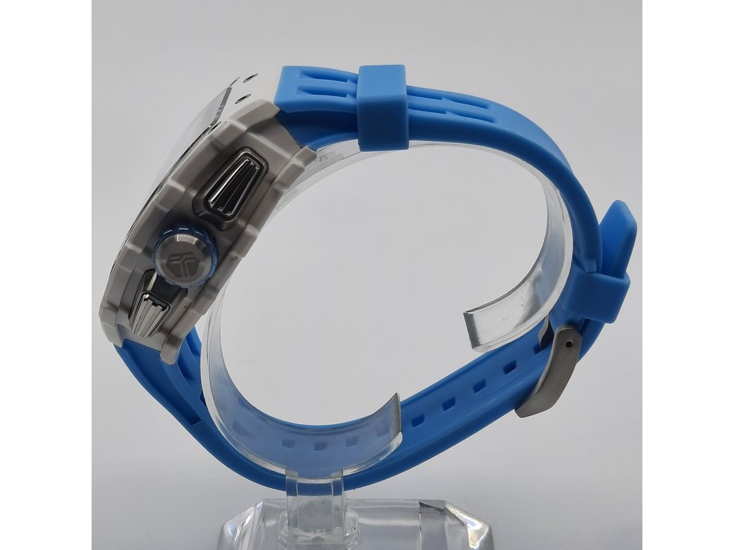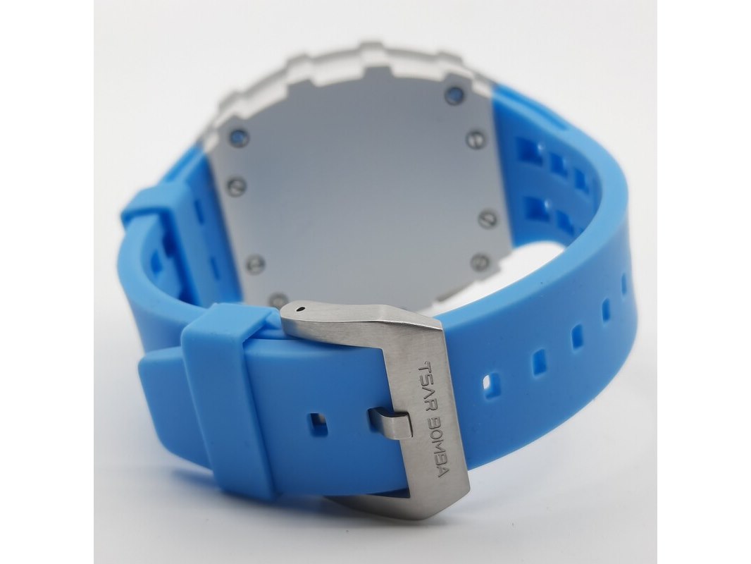 Merk: Tsar Product: Heren polshorloge Conditie: Gebruikt Specificaties: Een onedel heren polshorloge, Tsar Bomba, chronograaf, witte kunststof kast aan blauw kunststof band. Geen doos en geen certificaat.