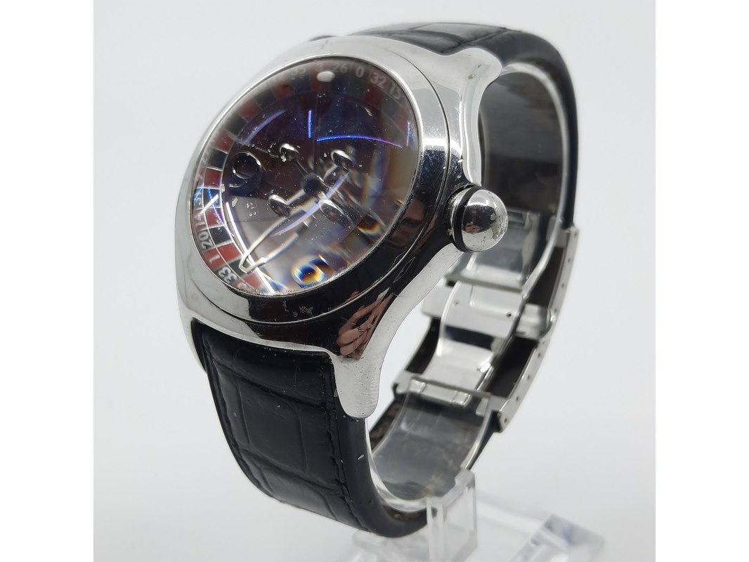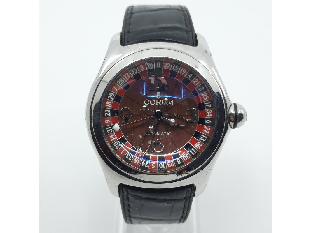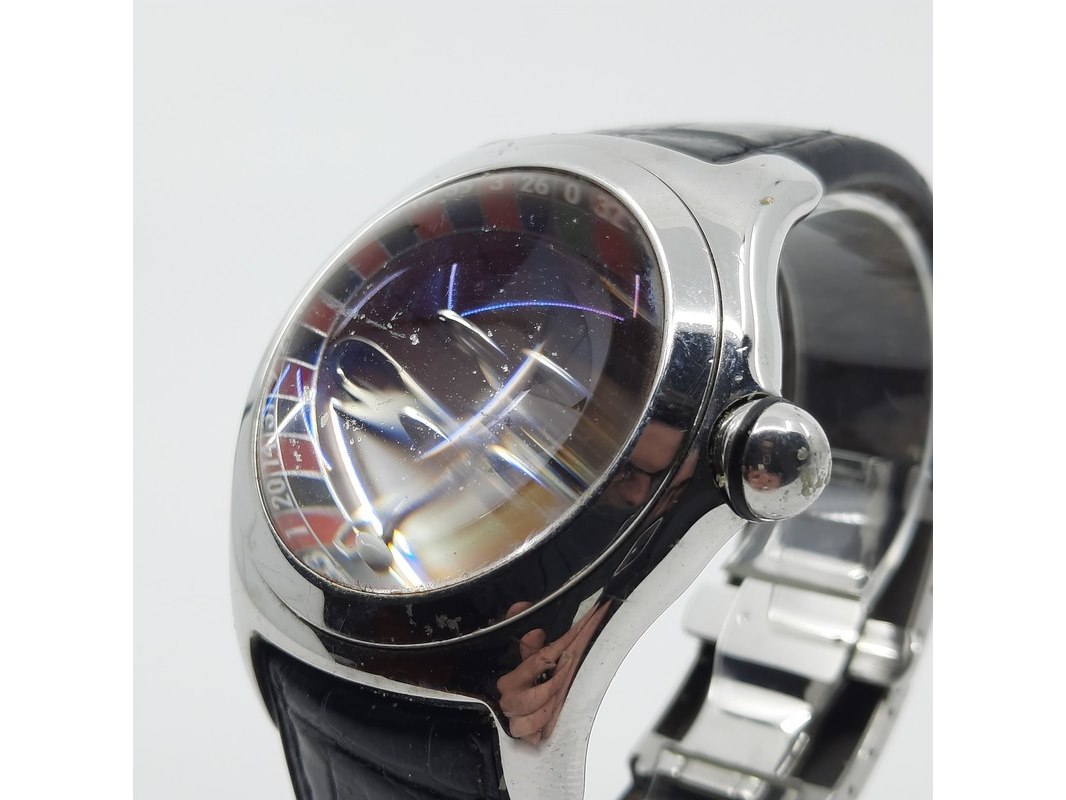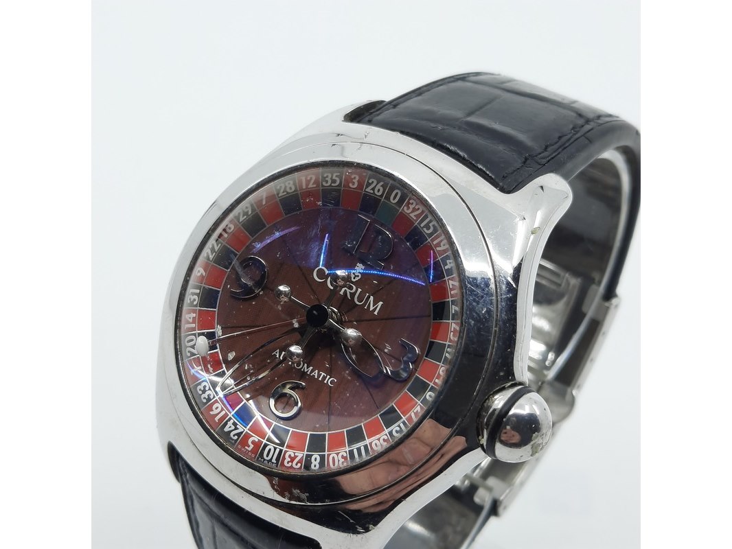 Merk: Corum Product: Heren polshorloge Conditie: Gebruikt Specificaties: Een stalen polshorloge. Merk Corum, type Bubble met Roulette wijzerplaat. Referentienummer 082.31020. Kast en lunette beschadigd. Aa n lederen band. Geen doos, geen documentatie.