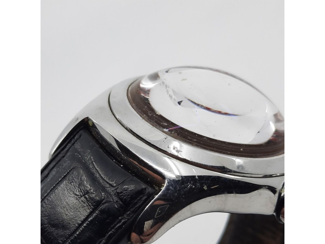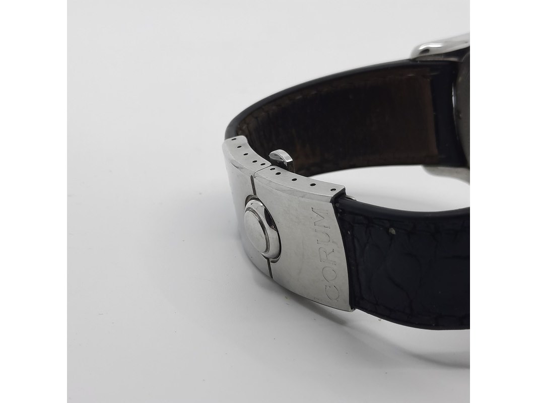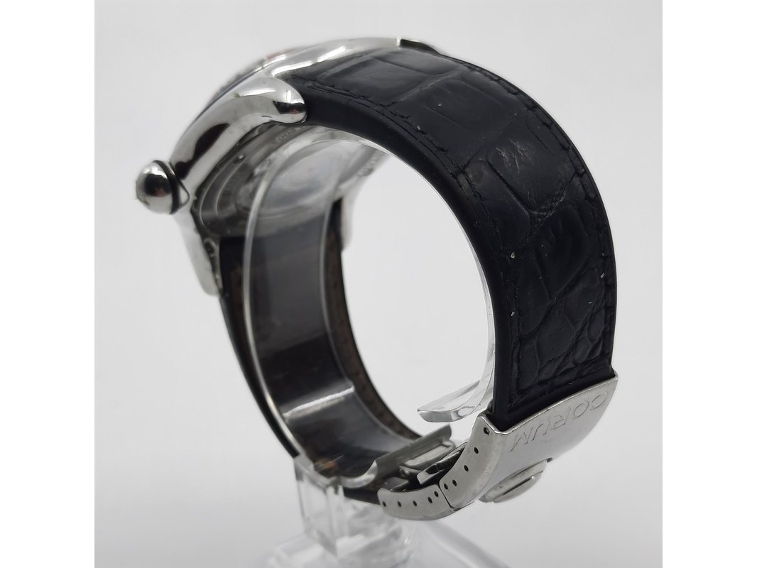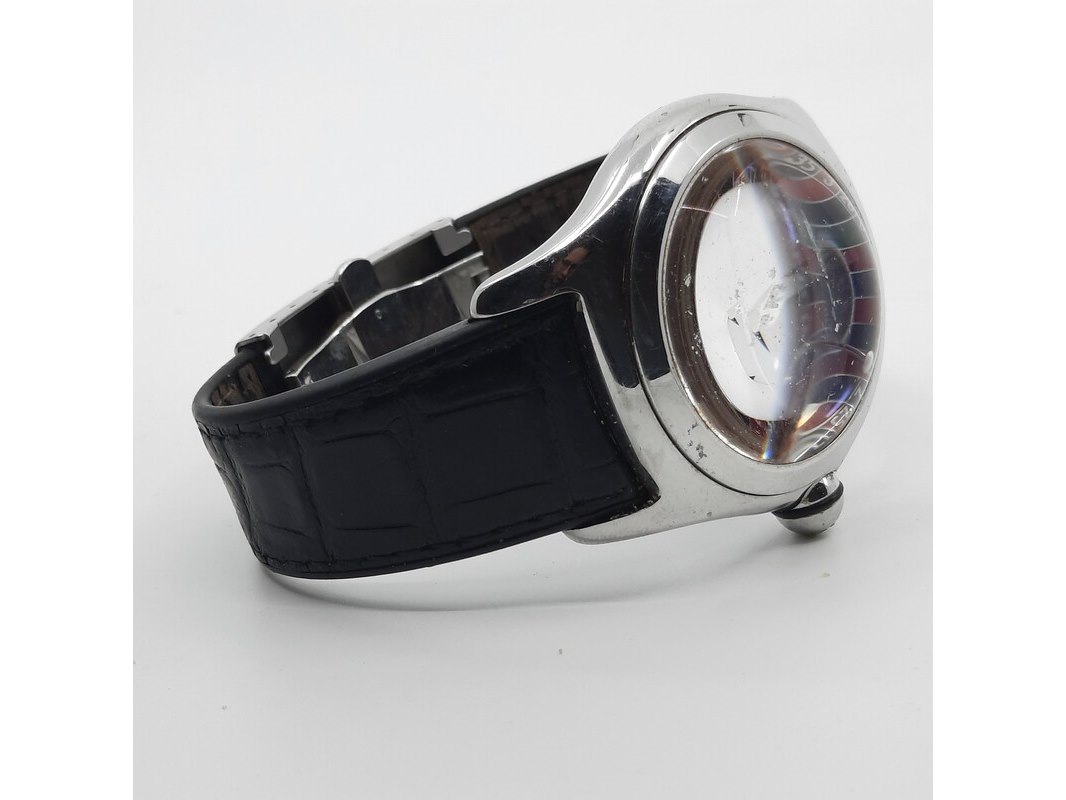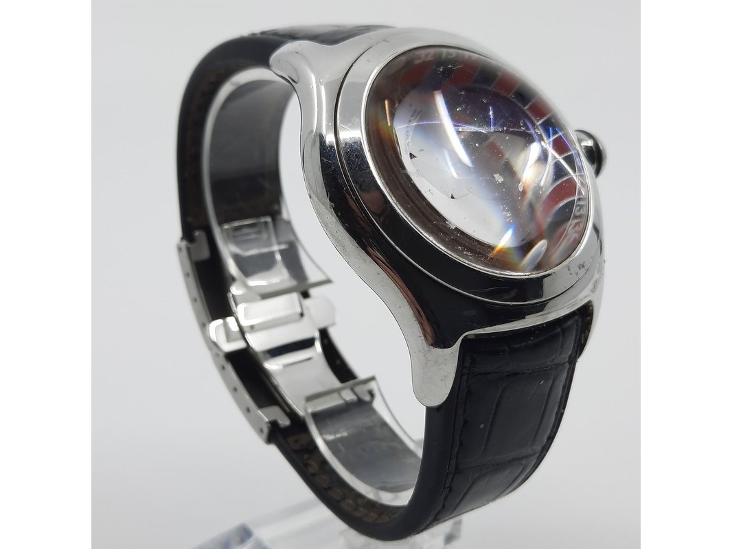 Merk: Corum Product: Heren polshorloge Conditie: Gebruikt Specificaties: Een stalen polshorloge. Merk Corum, type Bubble met Roulette wijzerplaat. Referentienummer 082.31020. Kast en lunette beschadigd. Aa n lederen band. Geen doos, geen documentatie.