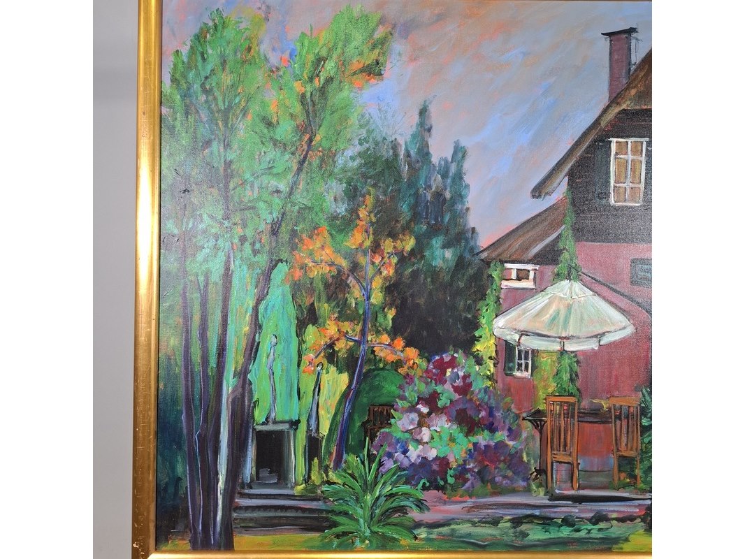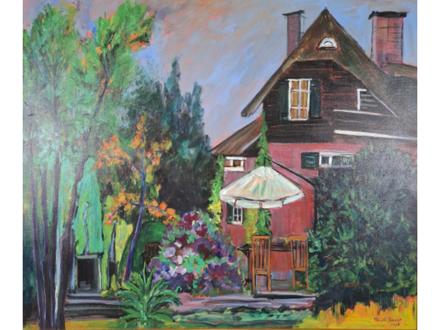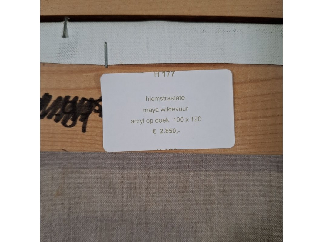Merk: Maya Wildevuur Product: Acryl schilderij Afmeting: Hxb ca. 107x127 cm BouwJaar: 1998 Specificaties: Lijst ligt los.