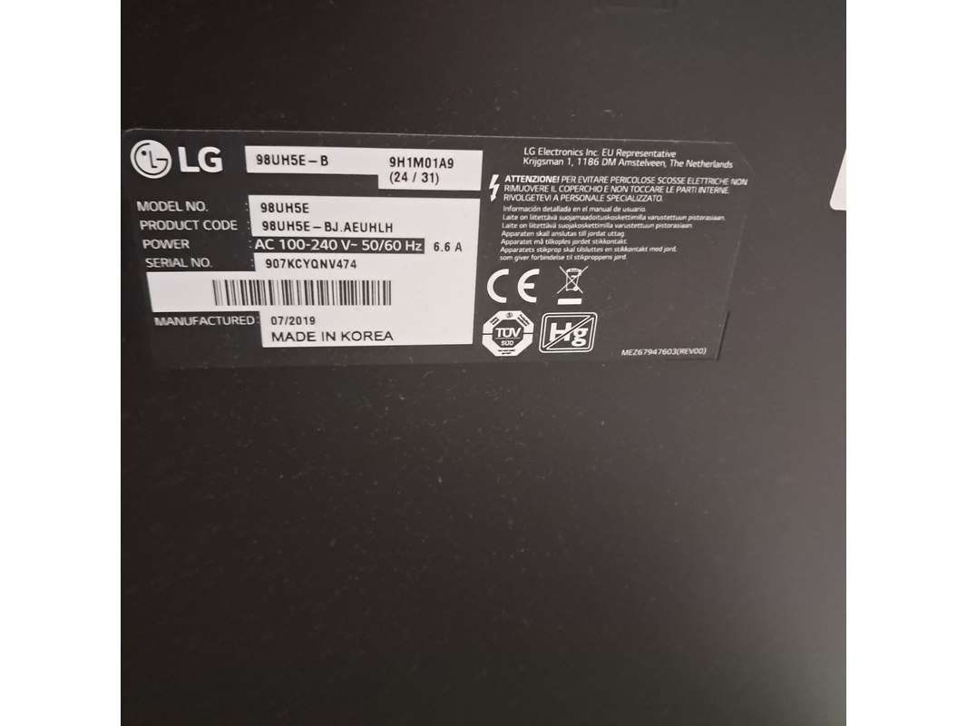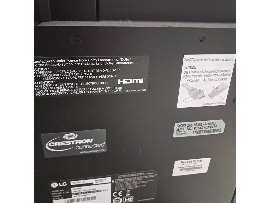 Merk: LG Product: Monitor Afmeting: Ca. 98 inch BouwJaar: 2019 Conditie: Gebruikt Specificaties: 100-240 V 50/60 Hz 6.6 A Technische staat, werking en compleetheid onbekend.
