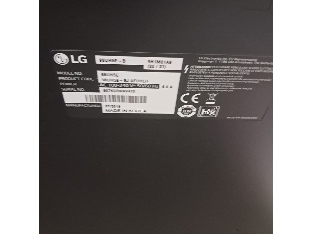 Merk: LG Product: Monitor Afmeting: Ca. 98 inch BouwJaar: 2019 Conditie: Gebruikt Specificaties: 100-240 V 50/60Hz 6.6 A Technische staat, werking en compleetheid onbekend.