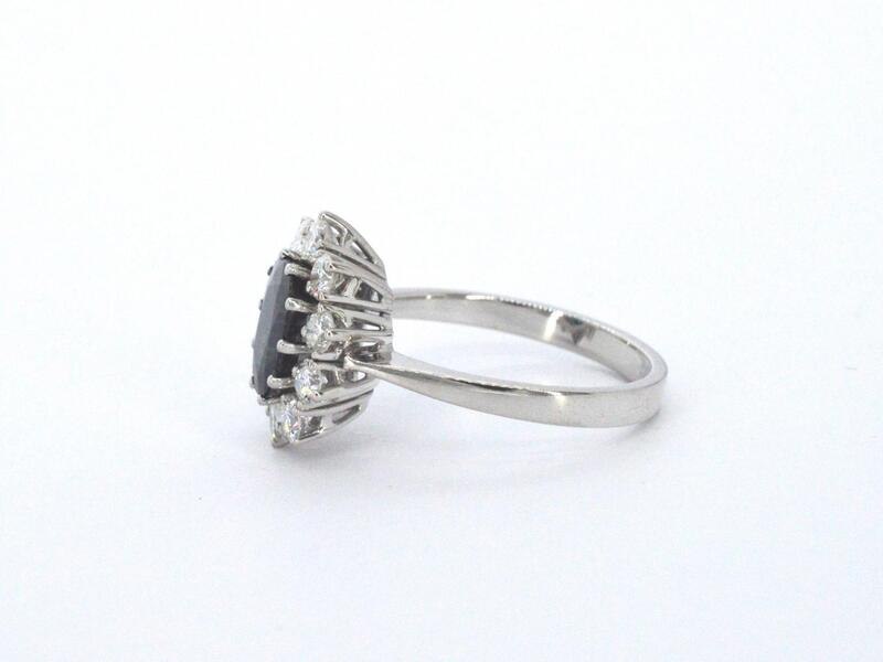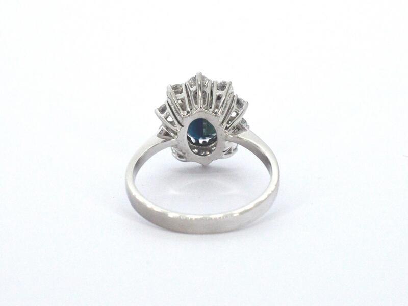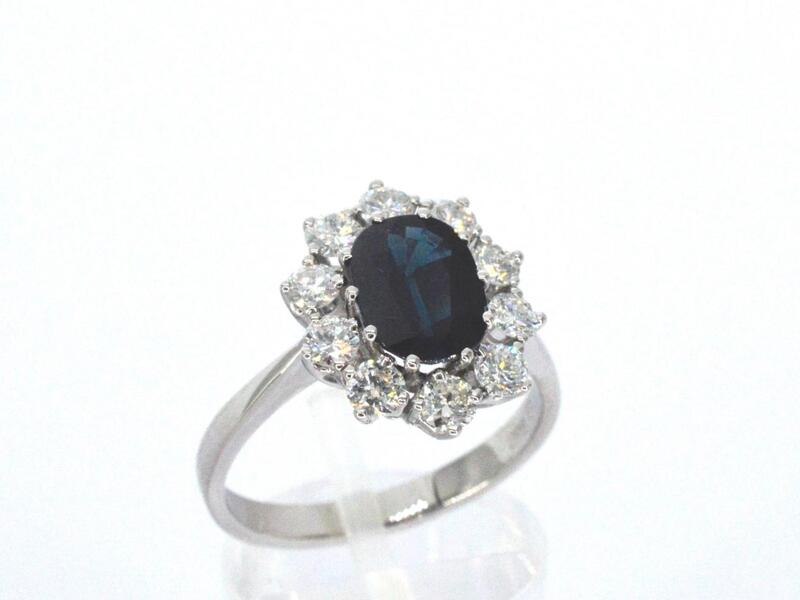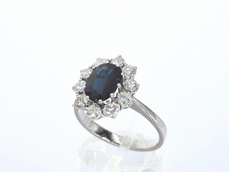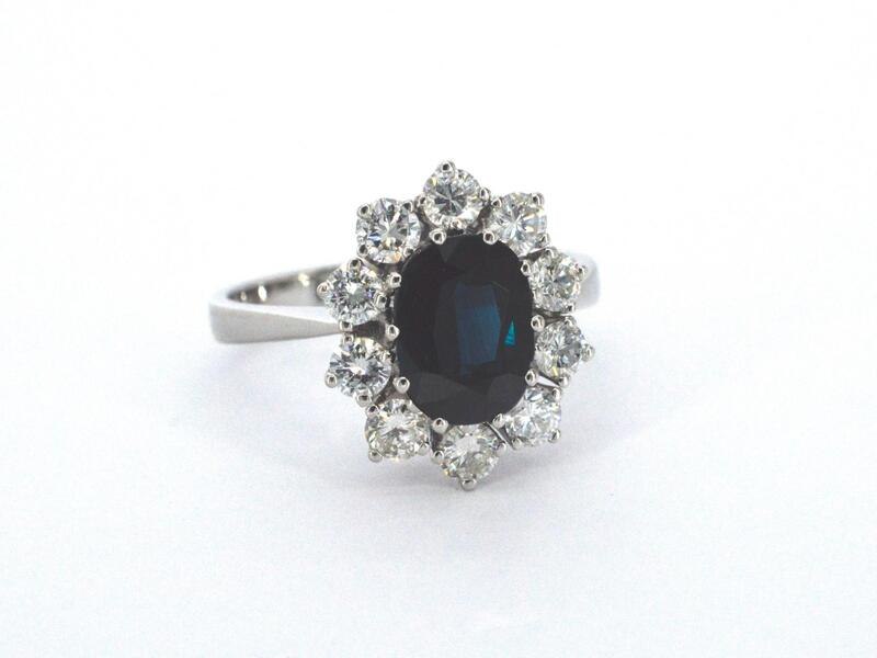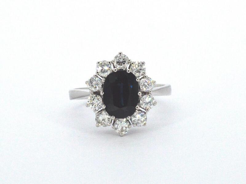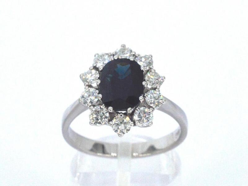 Product: Witgouden ring met een natuurlijke saffier en diamanten Specificaties: Diamant: Natuurlijk Aantal: 10 stuks Slijpvorm: Briljant geslepen Gewicht (carat): 0.70 carat Kleur: F-G Zuiverheid: VS-SI Slijpkwaliteit: Zeer mooi Edelsteen: Ondehandelde hoge kwaliteit saffier Aantal: 1 stuk Slijpvorm: ovaal geslepen Gewicht (carat): 2.00 carat Kleur: Diep oceaan blauw Zuiverheid: Zeer hoge zuiverheidsgraad Juweel: Ring Gewicht: 4.7 gram Ringmaat (op maat gemaakt*): 58 (18.5 mm) Materiaal: 14k goud (585) Conditie: Nieuw Verpakking: Luxe sieradendoos Toelichting: De kwaliteit is overgenomen van het rapport behorend bij item. De waardebepaling is een beoordeling van een gecertificeerde diamantair, gebaseerd op consumentenprijzen. Consumentenprijs: € 10.000,-