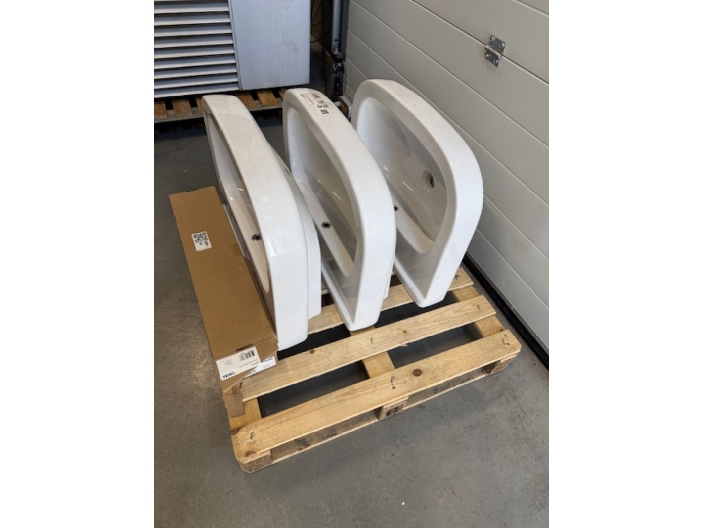 Merk: Geberit/Wisa Product: 3x Wastafel en 2x planchet Kleur: wit Materiaal: keramiek