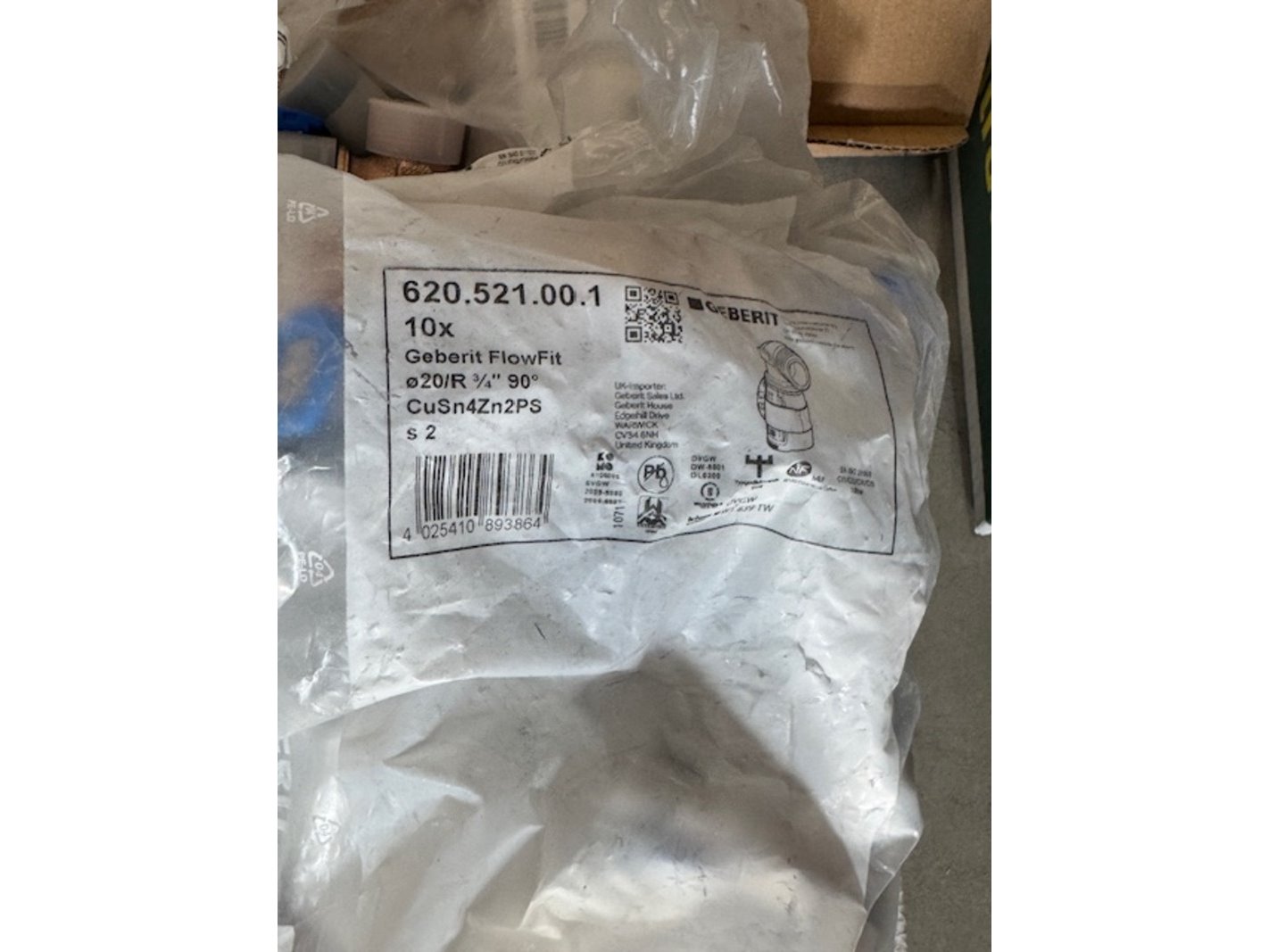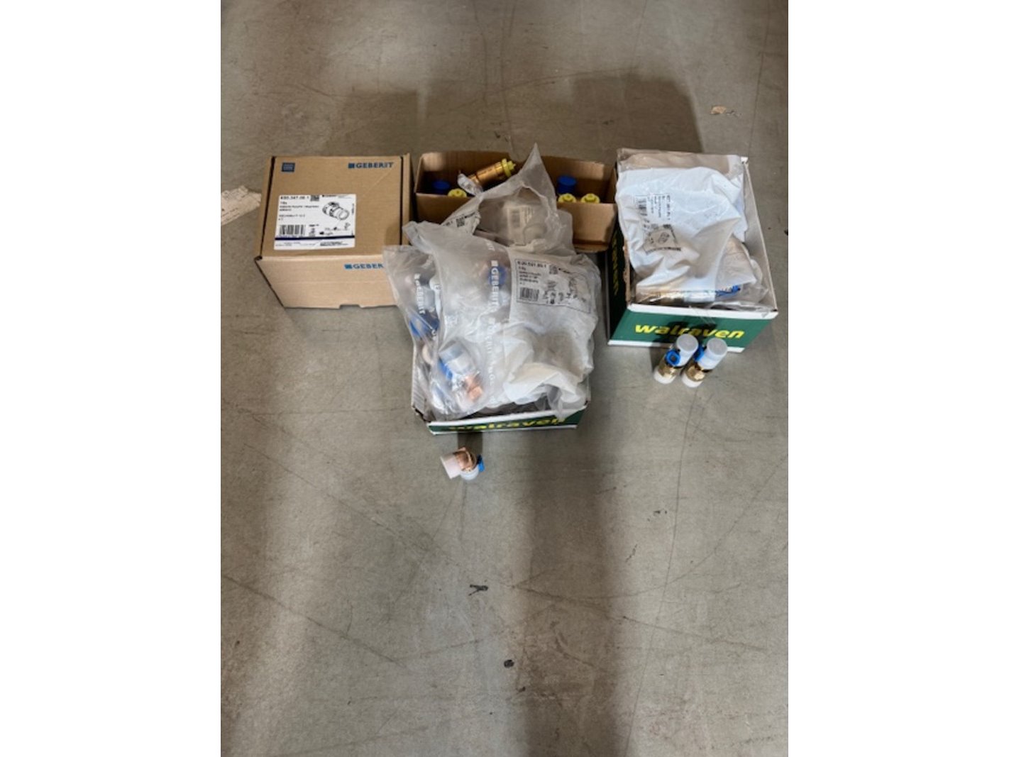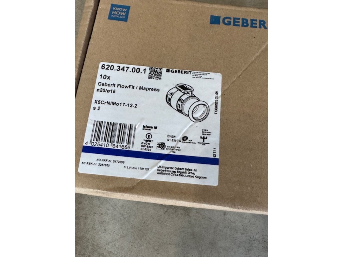 Merk: Geberit Product: Perskoppelingen Specificaties: 10x muurplaat; 30x 620.521.00.1; 2x flowfit 620.813.00.1; 20x flowfit 620.3122.00.1; 37x flowfit 620.591.00.1; 10x flowfit / mapress systeemovergang 620.347.00.1