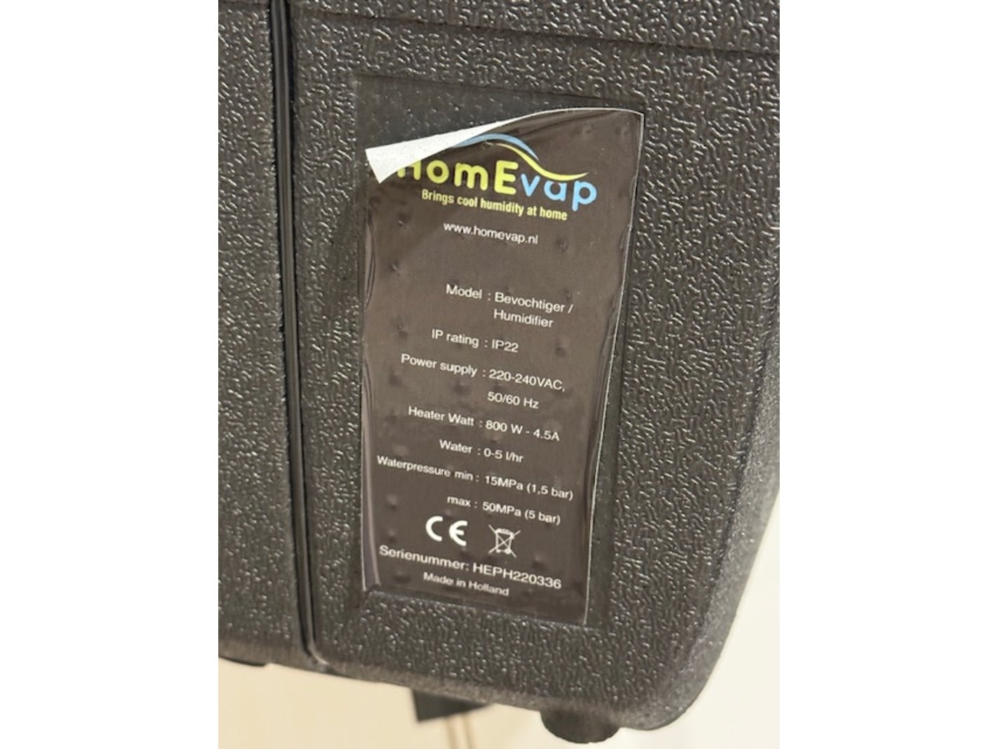 Merk: HomeVap Product: WTW luchtbevochtiger Specificaties: 220-240VAC 50/60hz 800w - 4.5A