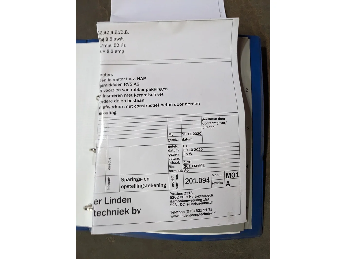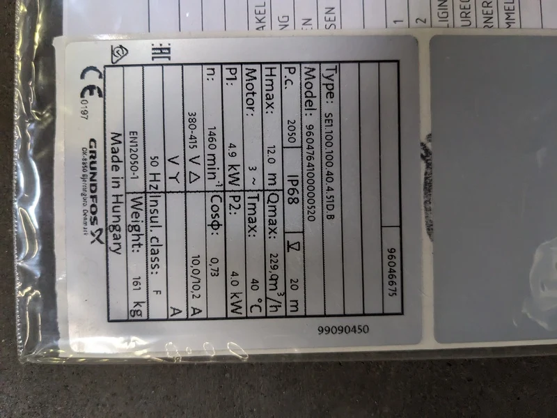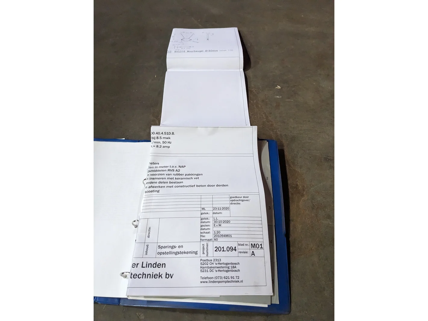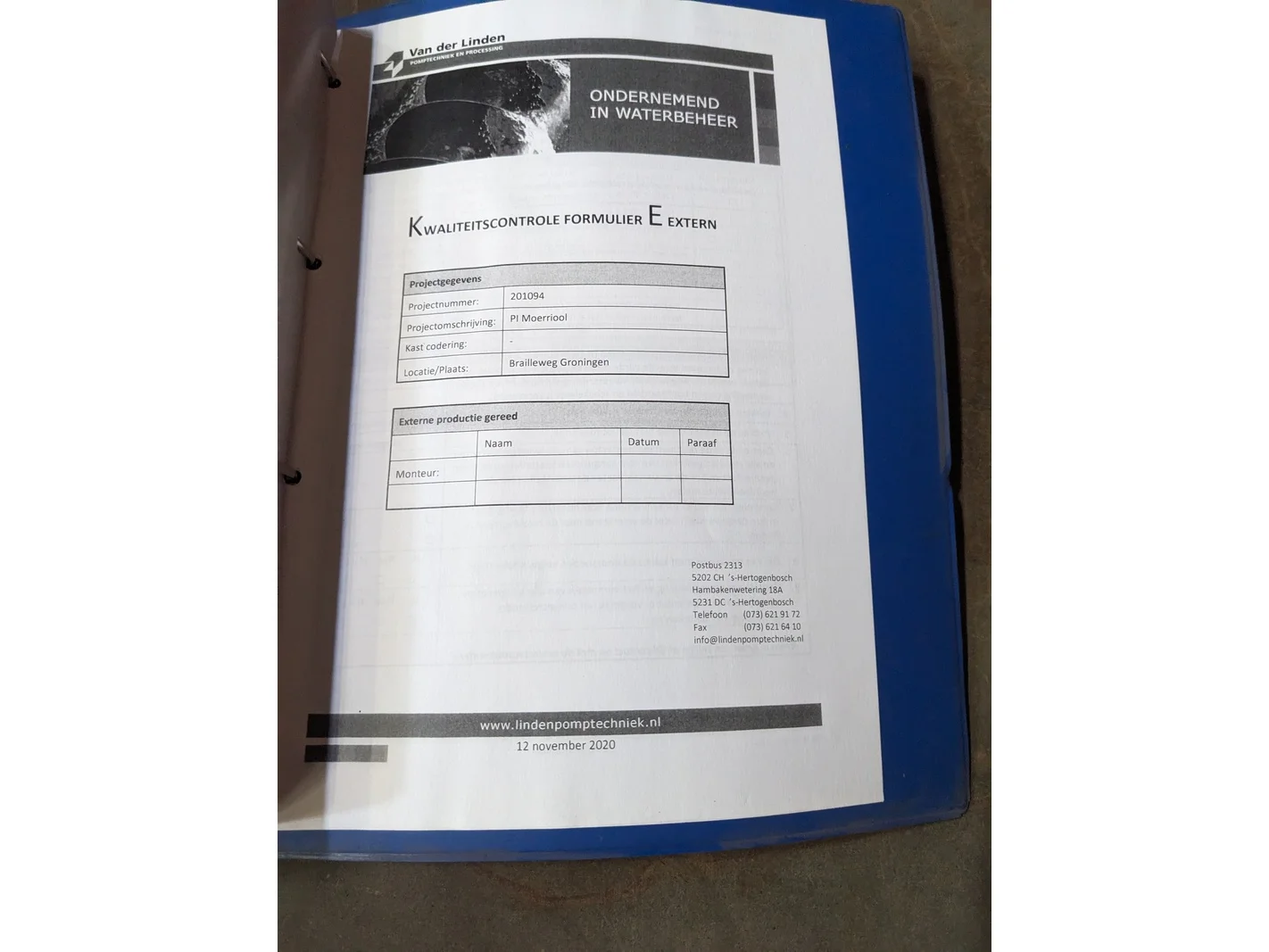 Merk: Grundfos Product: Pomp installatie met schakelkast t.b.v. Infra project Conditie: nieuw Specificaties: Kavel bestaat uit: 2x Pomp Grundfos SE1.100.100.40.4.51D.B. 4kW SDS 2x Ophangkoord 12-25mm tbv pompkabels 2x Voetbocht Grundfos DN100 2x FFRe-stuk DN100/150 2x Balkeerklep DN150 3x Overschuifflens Ø160mm/DN150 3x Voorlaskraag Ø160mm 3x Elektrolas mof Ø160mm 2x Buis Ø160mm SDR17 lg .= ca. 2800mm 1x Elektrolas knie Ø160mm 1x Buis Ø160mm SDR17 lg .= ca.700mm 1x Elektrolas T-stuk Ø160mm 1x FFM-stuk DN150 lg .= 500mm 1x Afsluiter DN150 1x Verlengspindel incl. IBG g.d .= 1570mm 1x Bedieningssleutel t.b.v. afsluiter 1x FFR-stuk DN150/DN200 1x Overgangskoppeling DN200/Ø200mm HDPE trekvast 1x Contragewicht Van der Lindenpomptechniek 1x Staalkabel Ø6mm lg .= 5500mm 3x Vlotter Zie de technische specificaties elektro 4x Kettinghaak Van der Lindenpomptechniek 2x Hijsketting 500KG lg .= 7000mm vzv overname ogen 4x Geleidebuis 2" lg .= 5300mm 2x Geleidebuishouder Grundfos 2" 1x Fundatie Wordt bepaald na engineer electro 2x Muurbeugel Ø160mm w.a .= 320mm zie tekening 1x StraatpotVan der Lindenpomptechniek