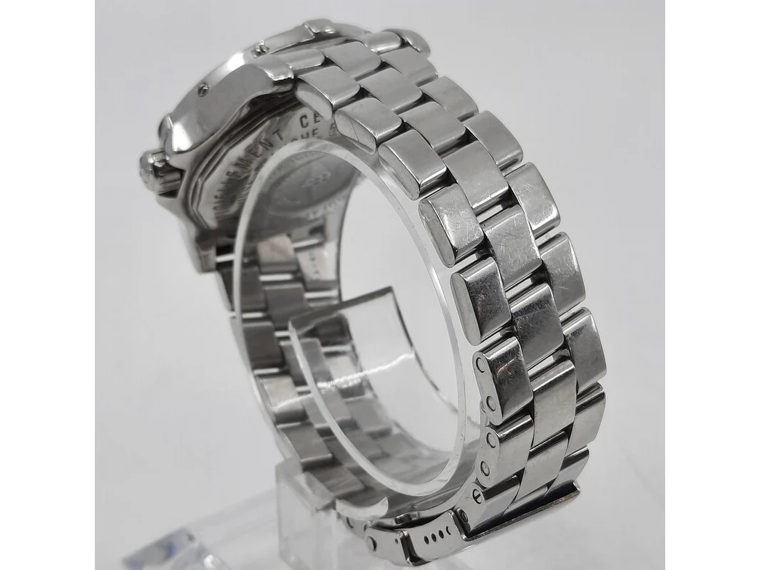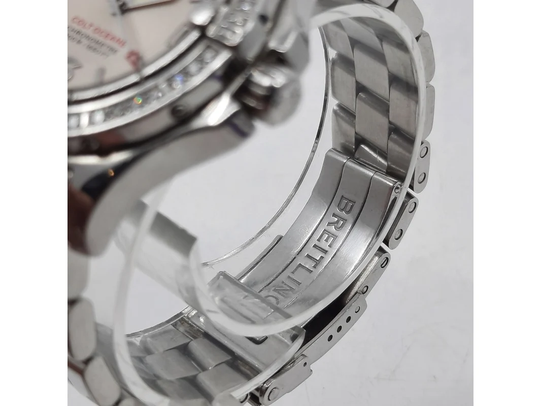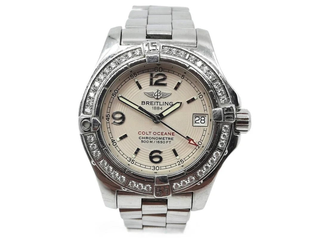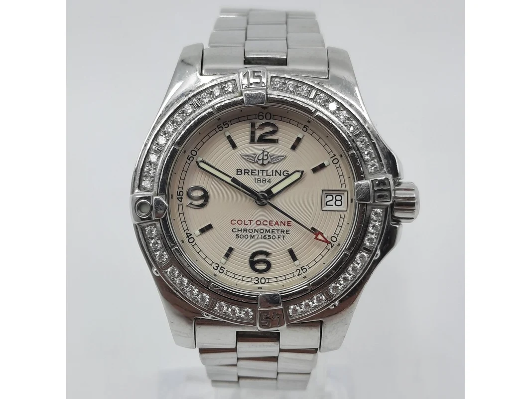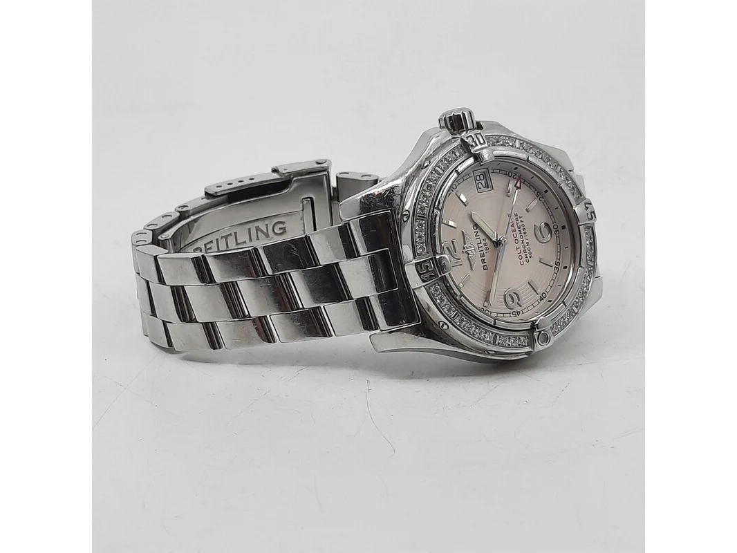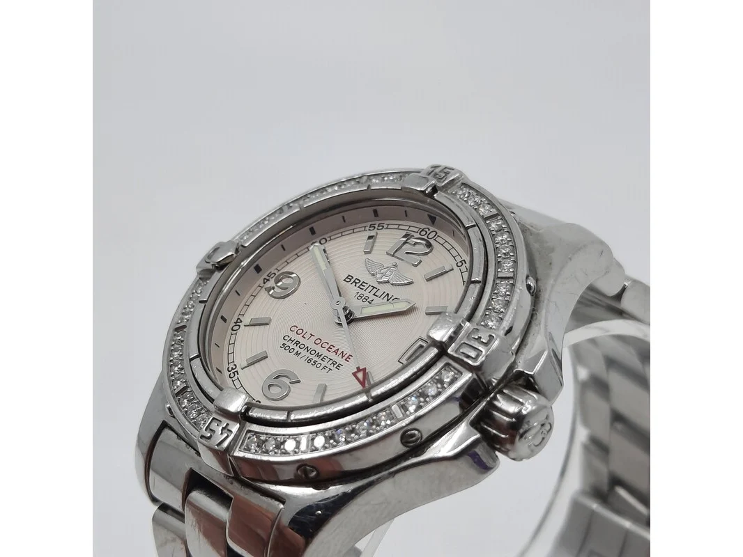 Merk: Breitling Product: Dames polshorloge Conditie: gebruikt Specificaties: Een stalen dames polshorloge, Breitling Colt Oceane A77380. Met draaibaar lunet met diamant bezet, argenté wijzerplaat, automatisch uurwerk en stalen professional model band. Geen doos en geen certificaat.
