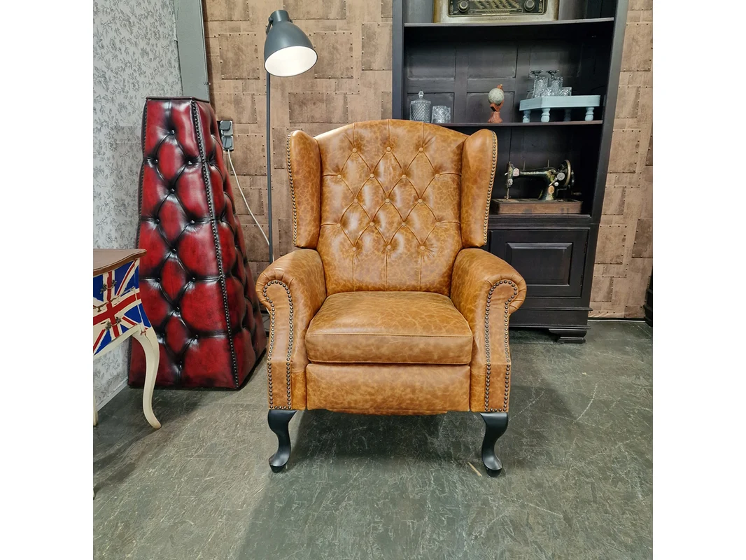 Merk: Chesterfield Product: Relaxfauteuil Kleur: bruin Materiaal: leer Afmeting: 111x82x95 Conditie: nieuw Specificaties: Afmetingen: Hoogte: 111 cm Breedte: 82 cm Diepte: 95 cm Zithoogte: 53 cm Zitdiepte: 52 cm