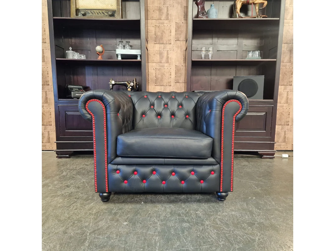 Merk: Chesterfield Product: Fauteuil Kleur: zwart/rood Materiaal: leer Afmeting: 79x100x92 Conditie: nieuw Specificaties: Afmetingen: Breedte: 100 cm Hoogte: 79 cm Diepte: 92 cm Zithoogte: 50 cm Zitdiepte: 56 cm Poothoogte: 8.5 cm