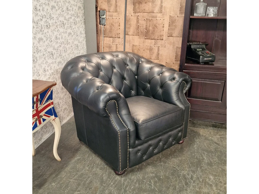 Merk: Chesterfield Product: Fauteuil Kleur: zwart Materiaal: leer Afmeting: 81.5x102x100 Conditie: nieuw Specificaties: Afmetingen: Breedte: 102 cm Hoogte: 81.5 cm Diepte: 100 cm Zithoogte: 43 cm Zitdiepte: 57 cm Poothoogte: 5 cm