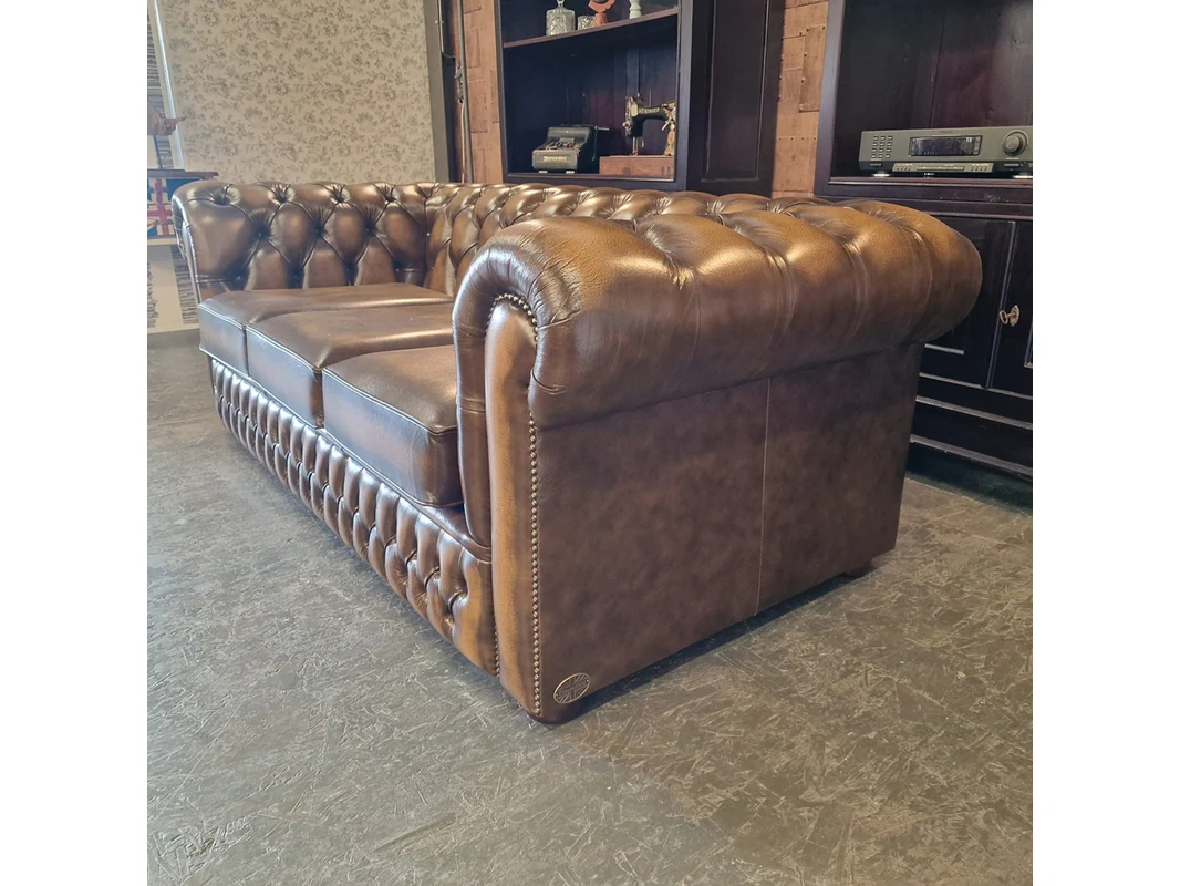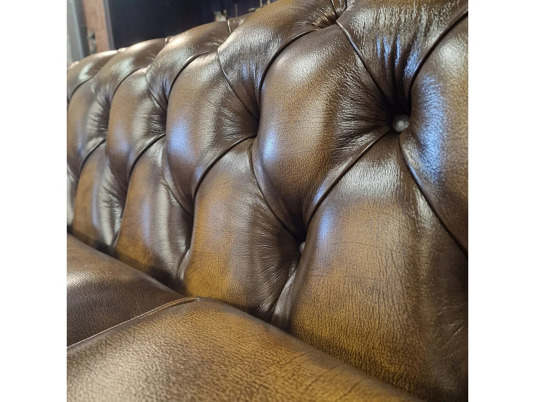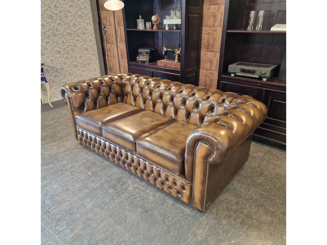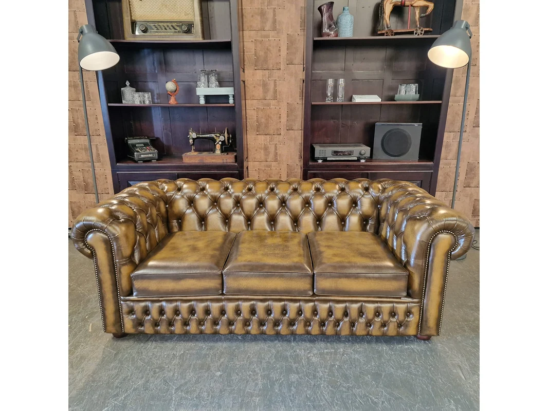 Merk: Chesterfield Product: 3-zits bank Kleur: geel/goud Materiaal: leer Afmeting: 67x189x92 Conditie: nieuw Specificaties: Afmetingen: Breedte: 189 cm Hoogte: 67 cm Diepte: 92 cm Zithoogte: 43 cm Zitdiepte: 61 cm