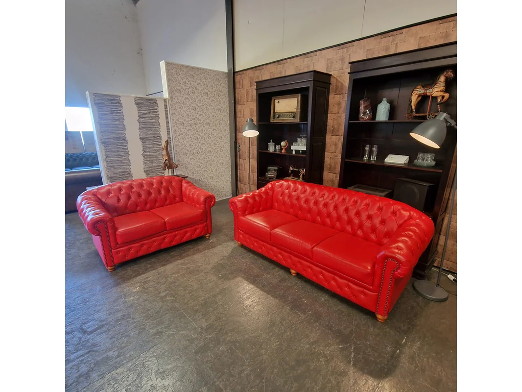 Merk: Chesterfield Product: 2-zits + 3-zits set Kleur: rood Materiaal: leer Afmeting: 79x195x92 Conditie: nieuw Specificaties: Afmetingen: Breedte: 195 cm Hoogte: 79 cm Diepte: 92 cm Zithoogte: 45 cm Zitdiepte: 55 cm Poot hoogte: 5 cm