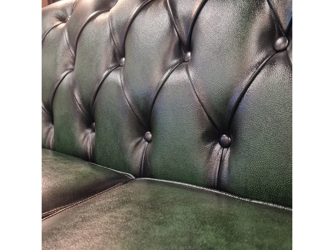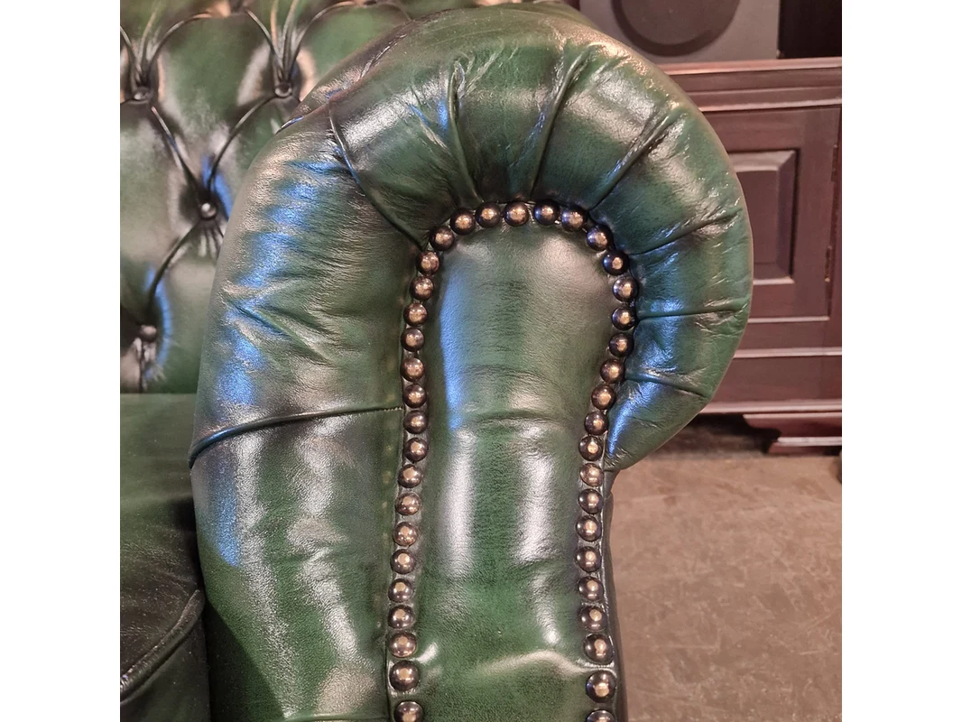 Merk: Chesterfield Product: 2-zits bank Kleur: groen Materiaal: leer Afmeting: 81.5x150x81.5 Conditie: nieuw Specificaties: Afmetingen: Breedte: 150 cm Hoogte: 79 cm Diepte: 92 cm Zithoogte: 45 cm Zitdiepte: 55 cm Poot hoogte: 5 cm