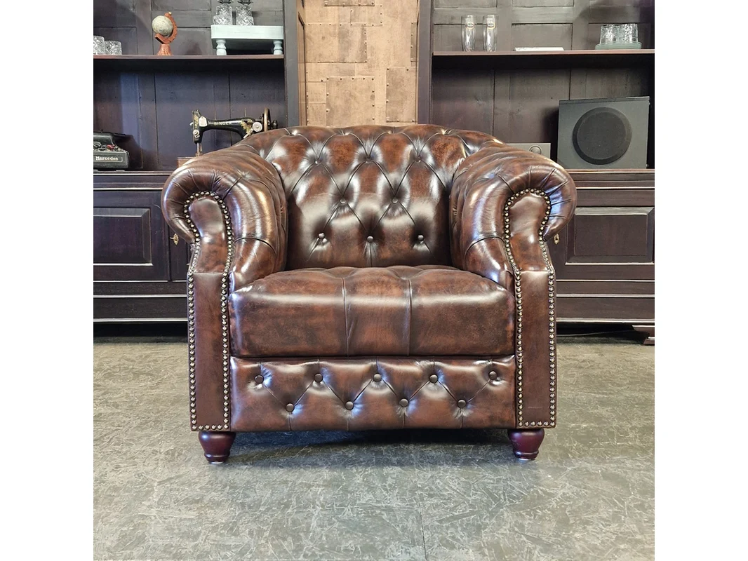 Merk: Chesterfield Product: Fauteuil Kleur: bruin Materiaal: leer Afmeting: 81.5x102x100 Conditie: nieuw Specificaties: Afmetingen: Breedte: 102 cm Hoogte: 81.5 cm Diepte: 100 cm Zithoogte: 43 cm Zitdiepte: 57 cm