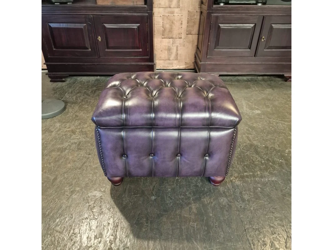 Merk: Chesterfield Product: Hocker Kleur: paars Materiaal: leer Afmeting: 44x65x57 Conditie: nieuw Specificaties: Afmetingen: Breedte: 65 cm Hoogte: 44 cm Diepte: 57 cm