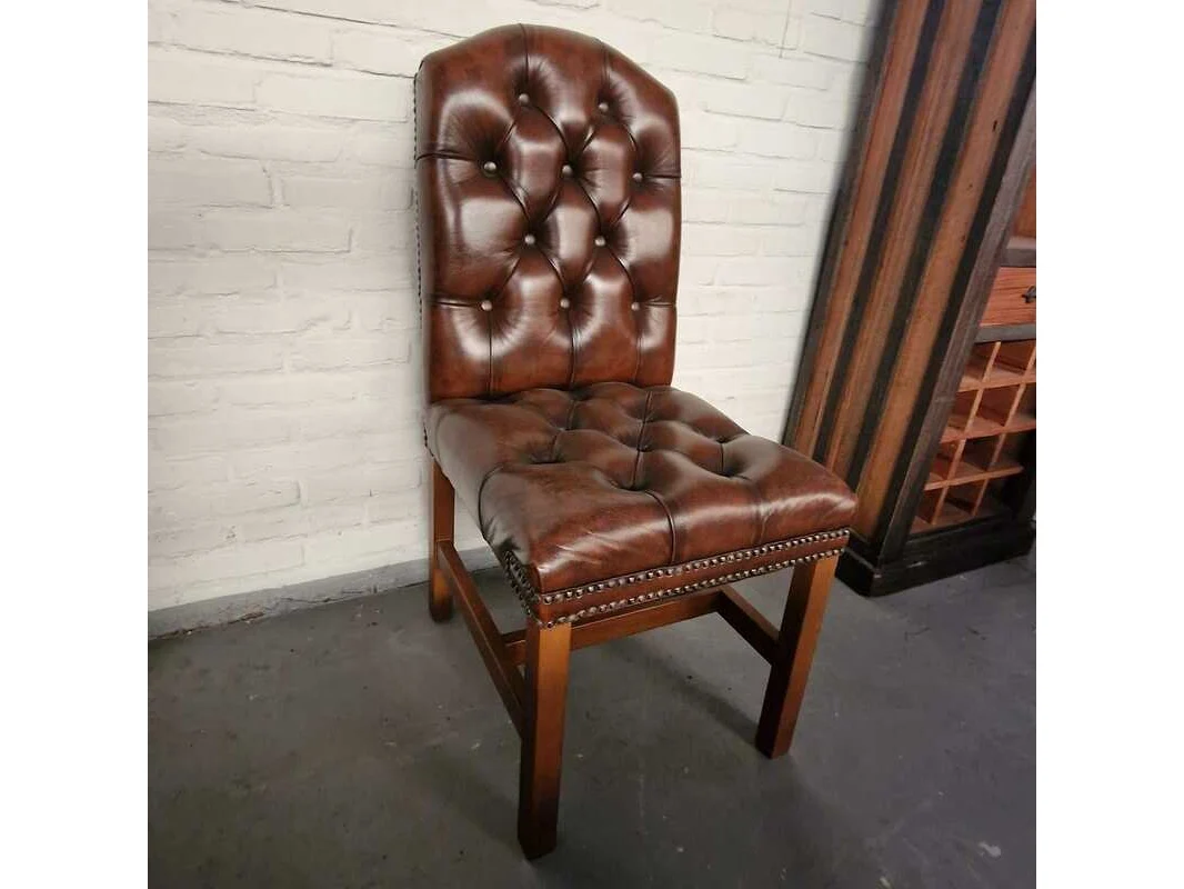 Merk: Chesterfield Product: Eetkamerstoel Kleur: bruin Materiaal: leer Afmeting: 105x47x66 Conditie: nieuw Specificaties: Afmetingen: Breedte: 47 cm Hoogte: 105 cm Diepte: 66 cm Zithoogte: 50 cm Zitdiepte: 49 cm