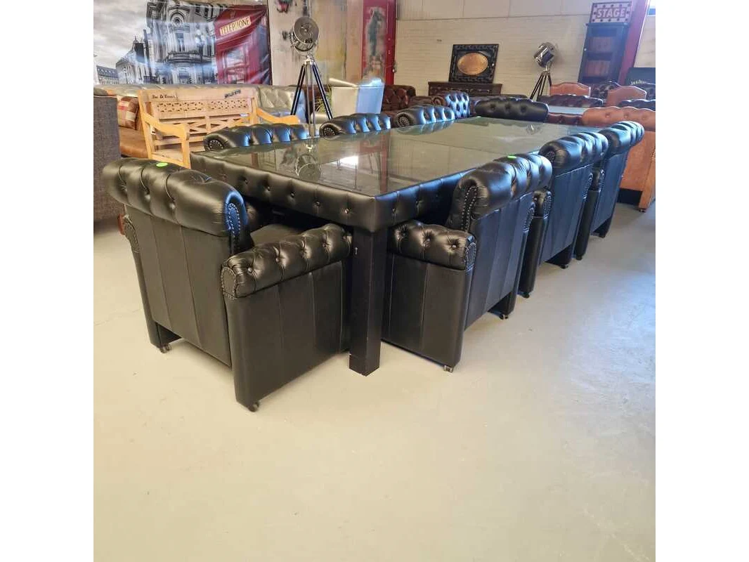 Merk: Chesterfield Product: Eetkamertafel Kleur: zwart Materiaal: leer Afmeting: 82x300x120 Conditie: nieuw Specificaties: Afmetingen: Breedte: 300 cm Hoogte: 82 cm Diepte: 120 cm