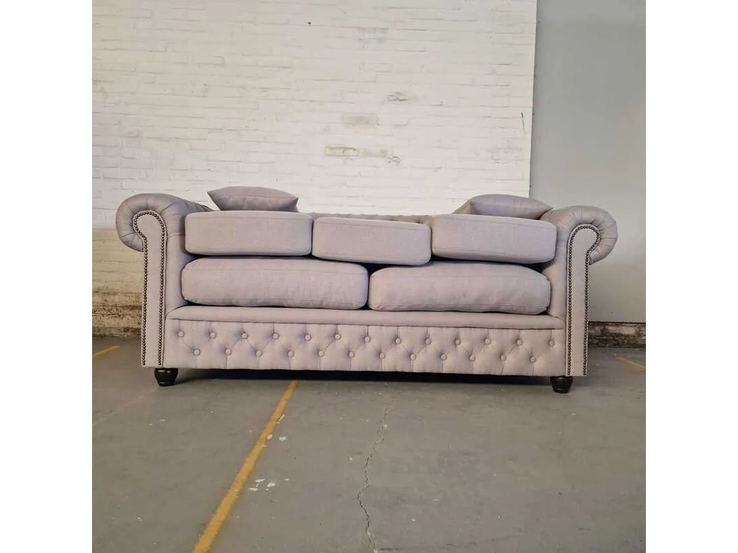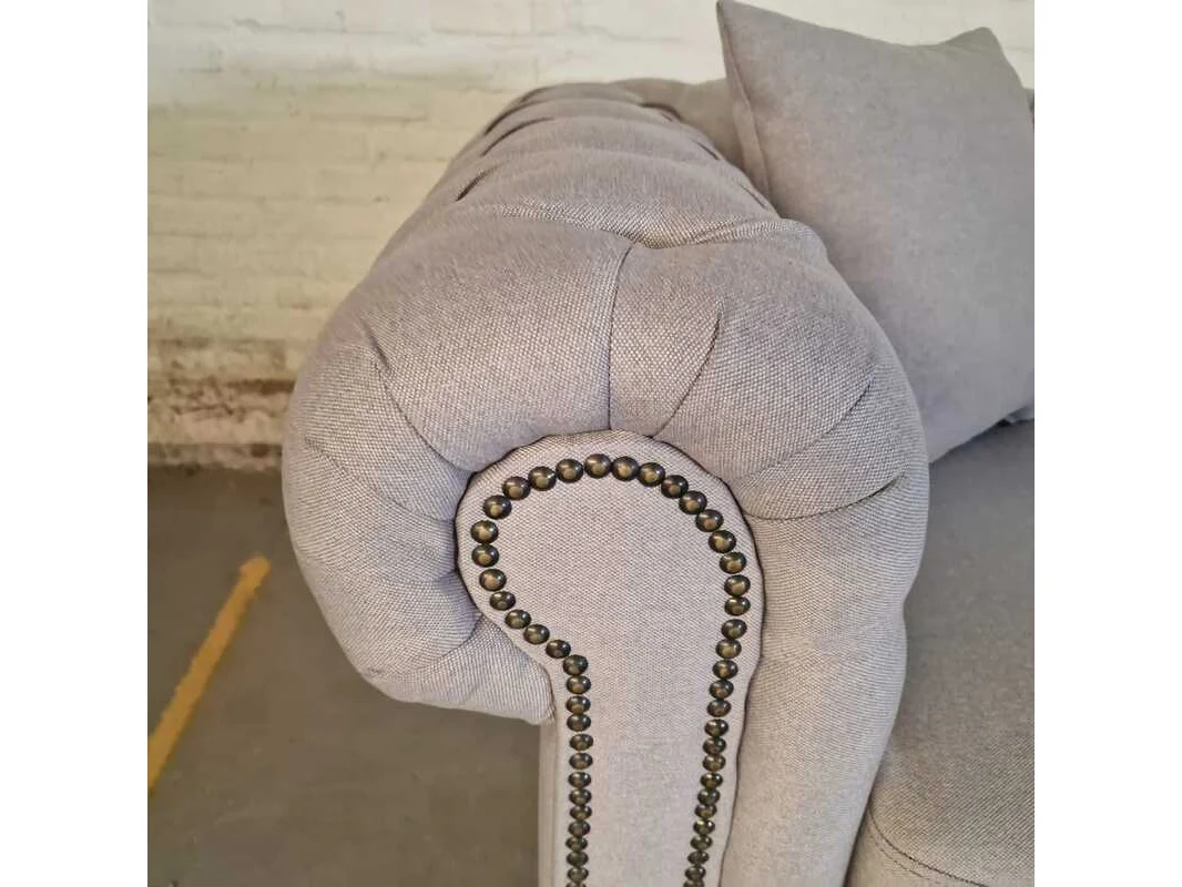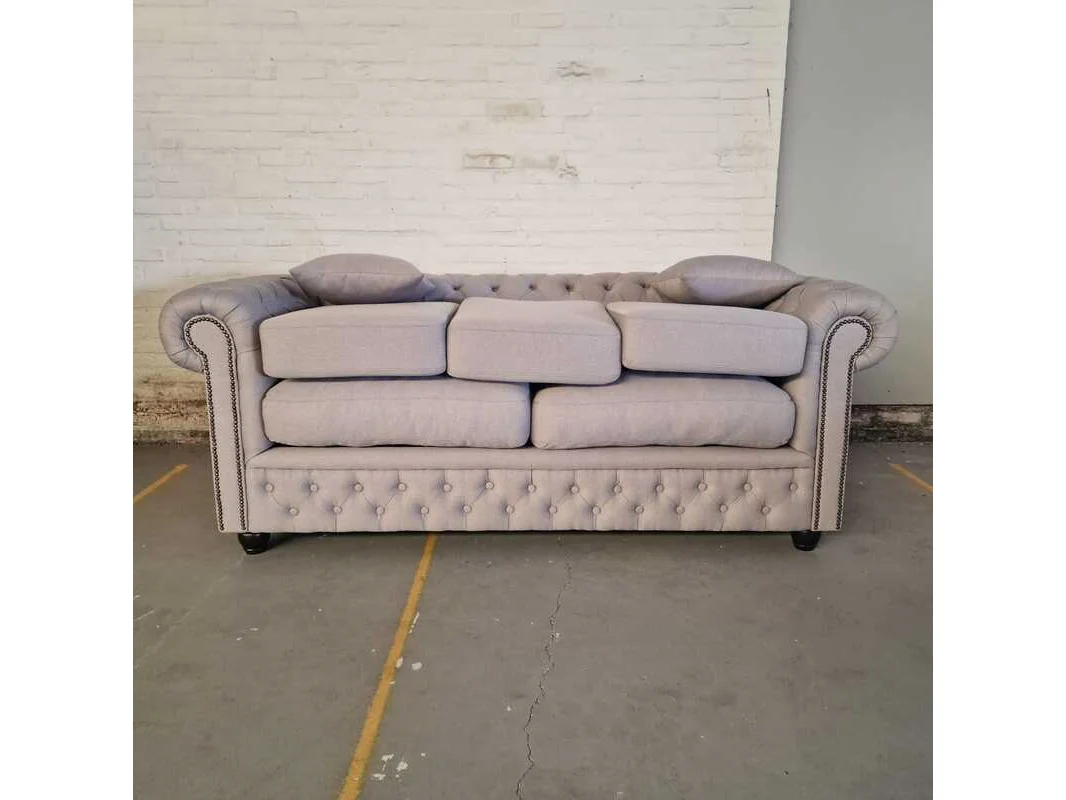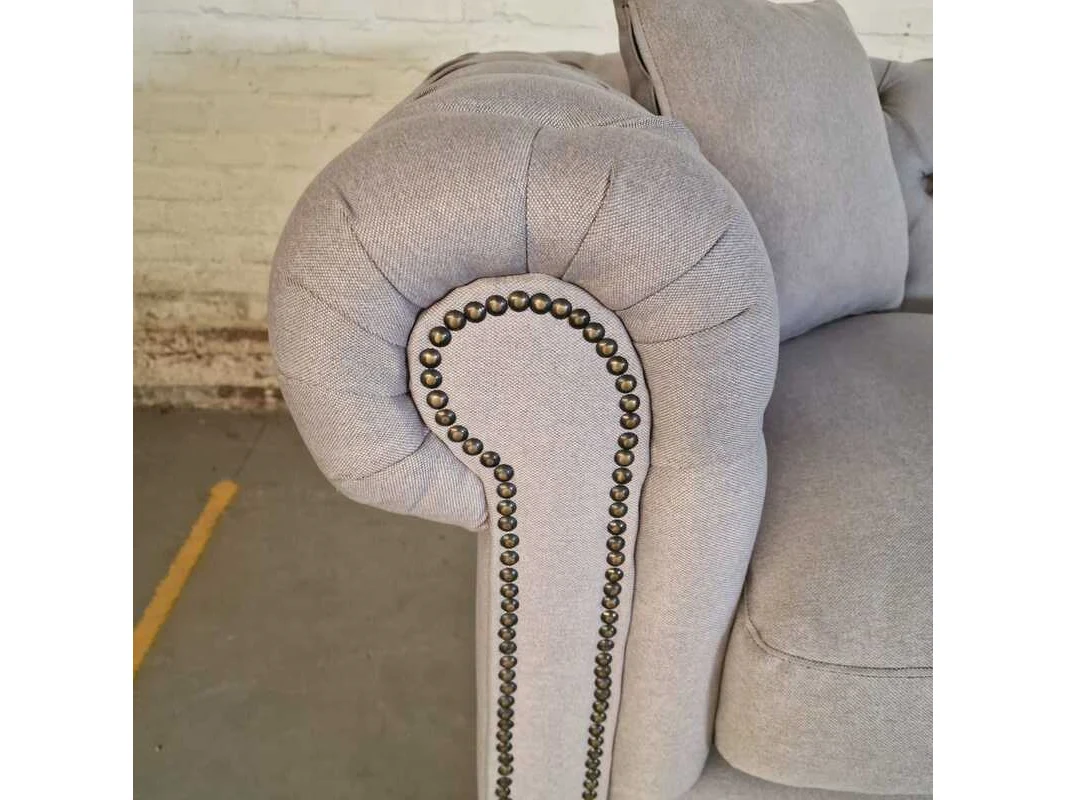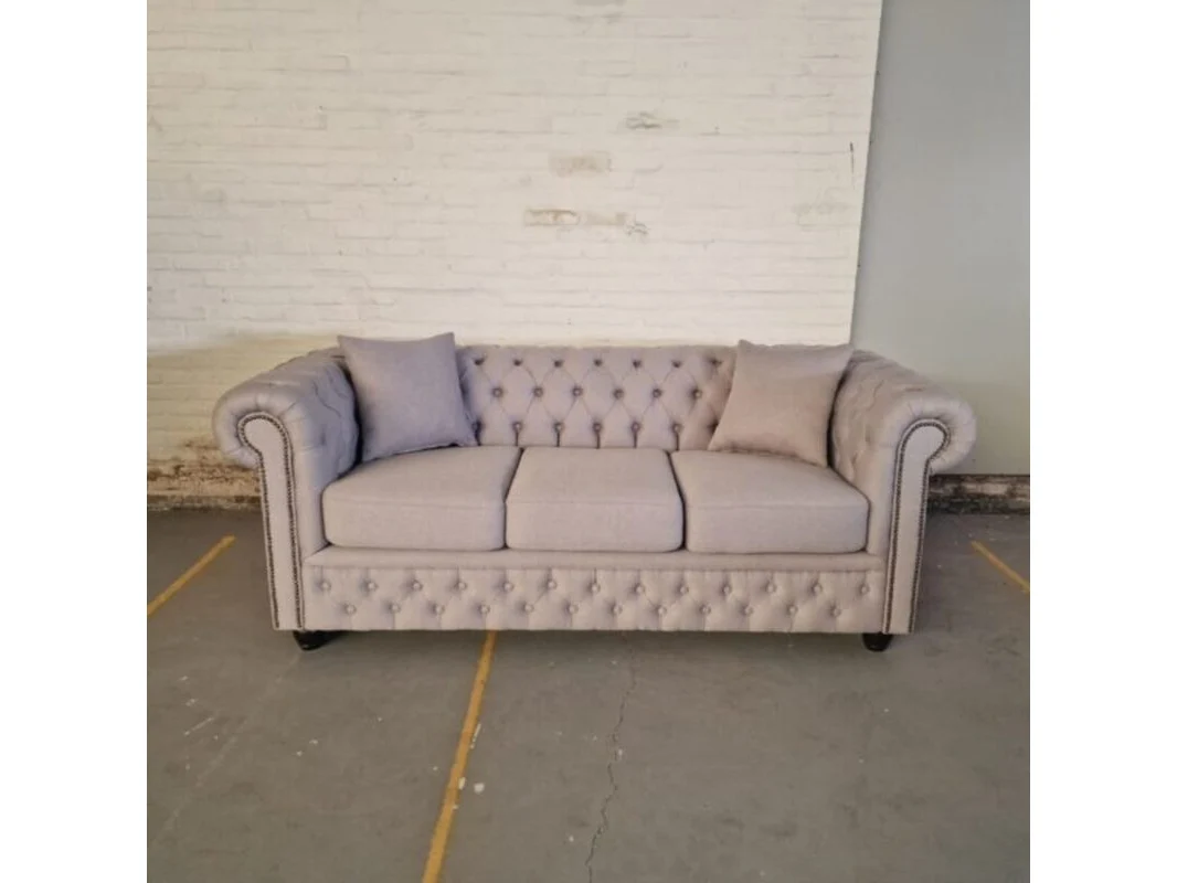 Merk: Chesterfield Product: 3-zitsbank Kleur: grijs Materiaal: stof Afmeting: 79x200x92 Conditie: nieuw Specificaties: Afmetingen: Breedte: 200 cm Hoogte: 79 cm Diepte: 92 cm Zithoogte: 50 cm Zitdiepte: 56 cm